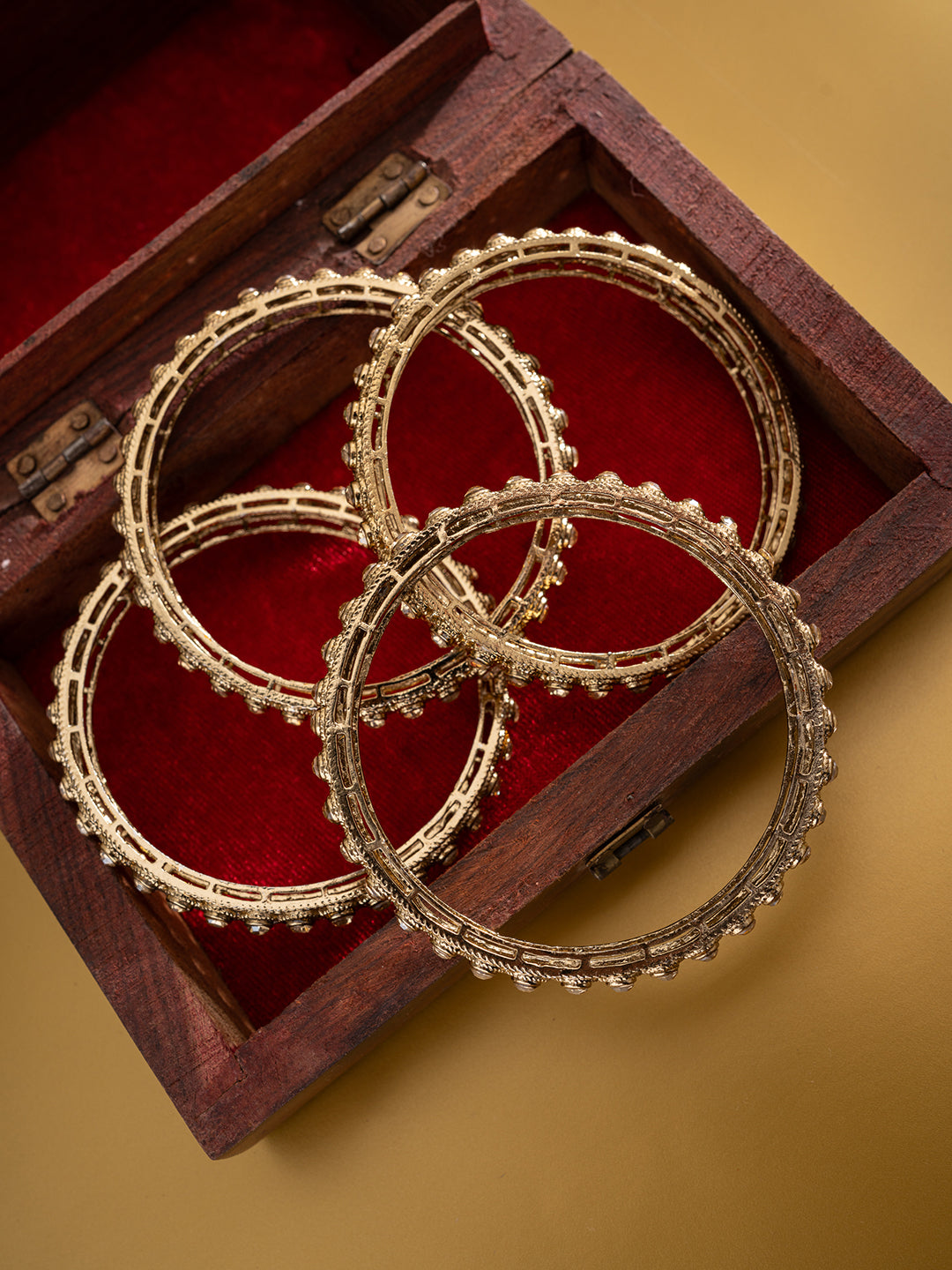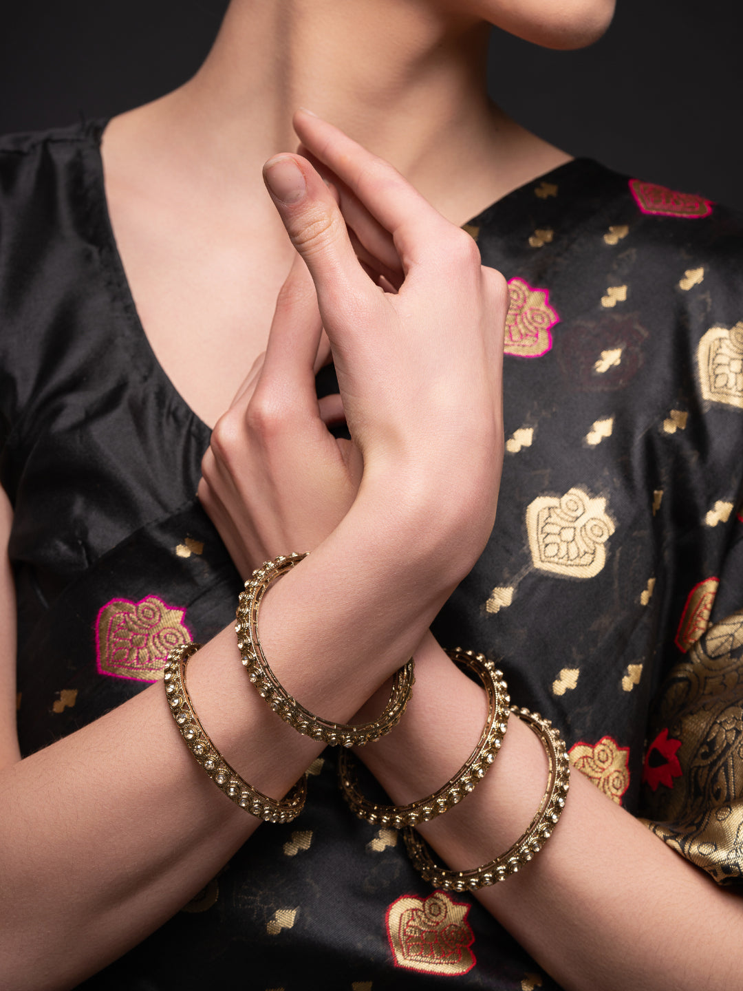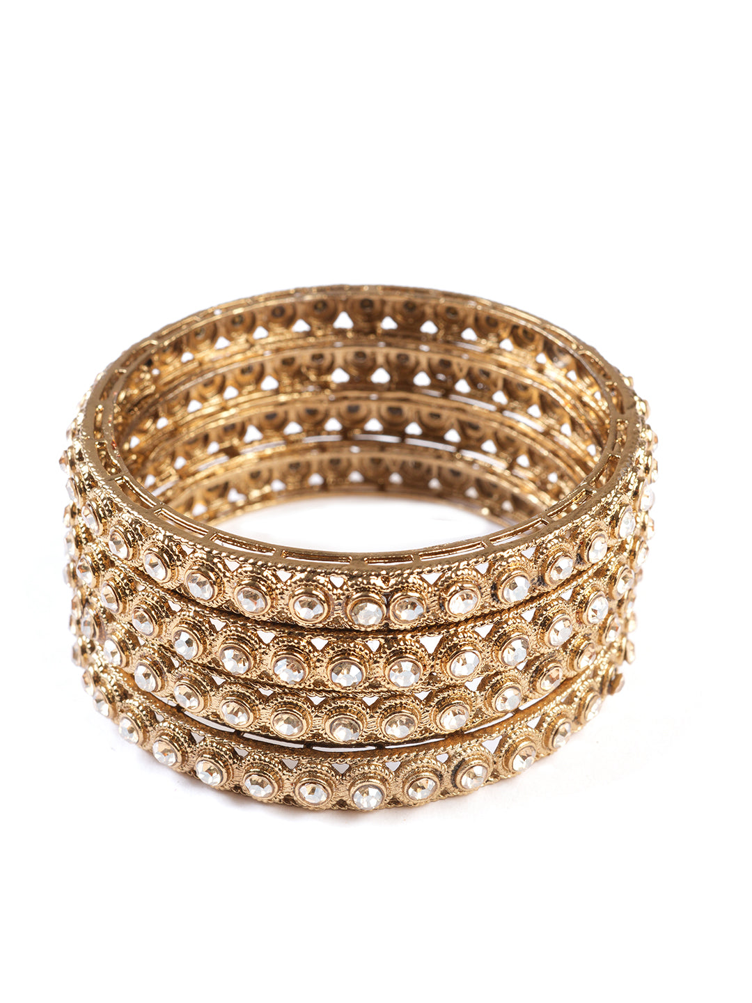 Set of 4 gold-plated bangles, each has white american diamond stone-studded details, secured with slip-on closure