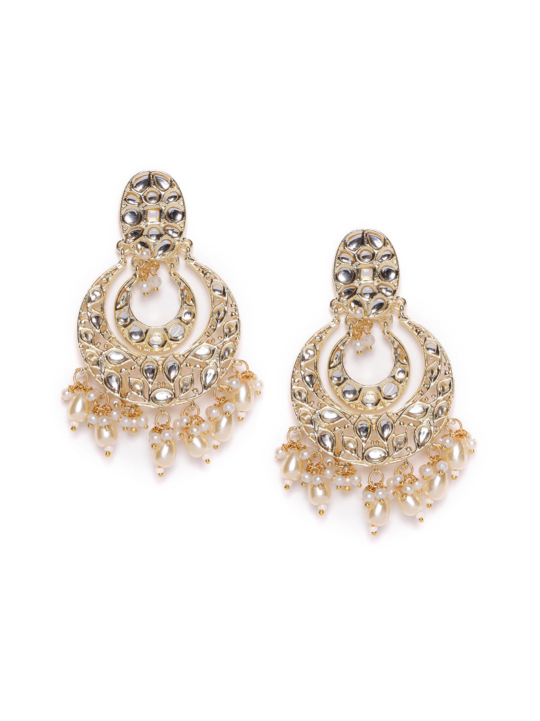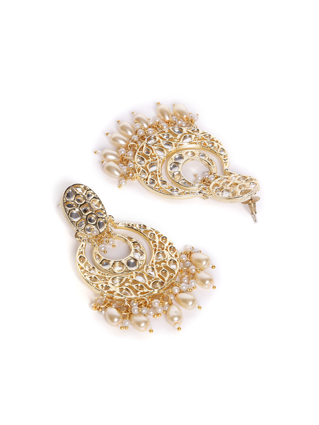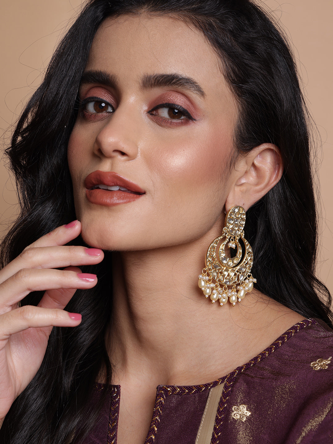 Gold-Plated Artificial Stones Studded and Beaded Contemporary Shaped Drop Earrings