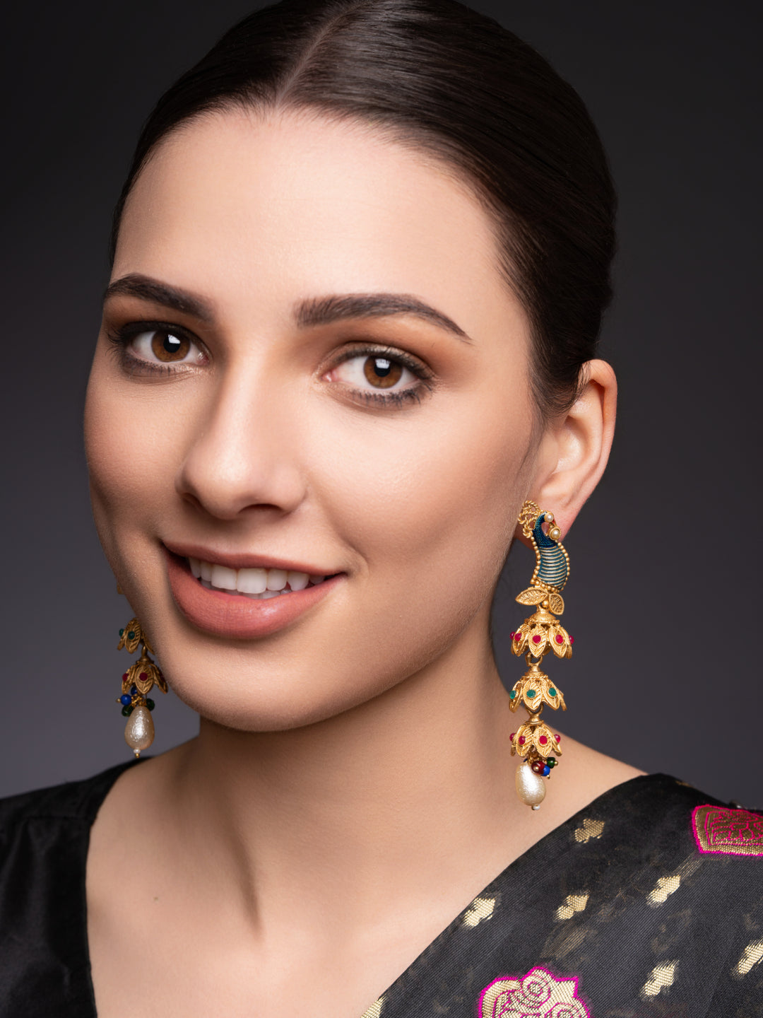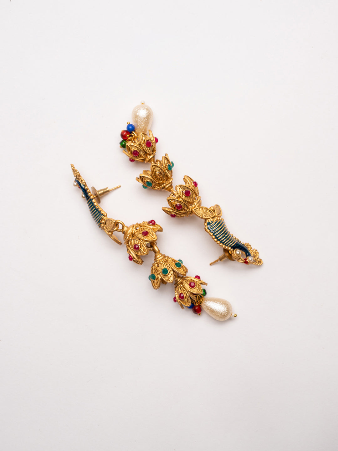 Gold-Plated Artificial Stones Studded And Beaded Peacock Shaped Drop Earrings