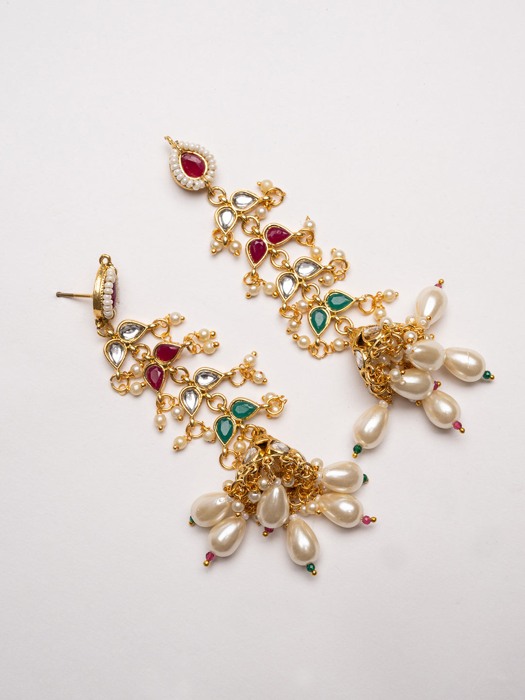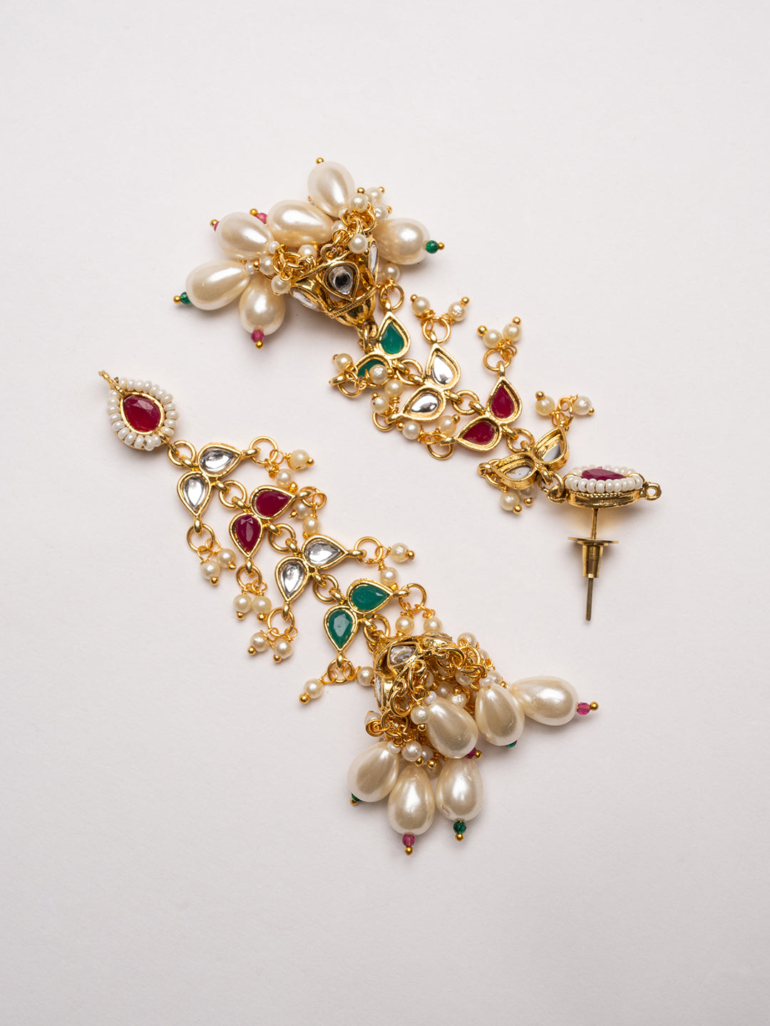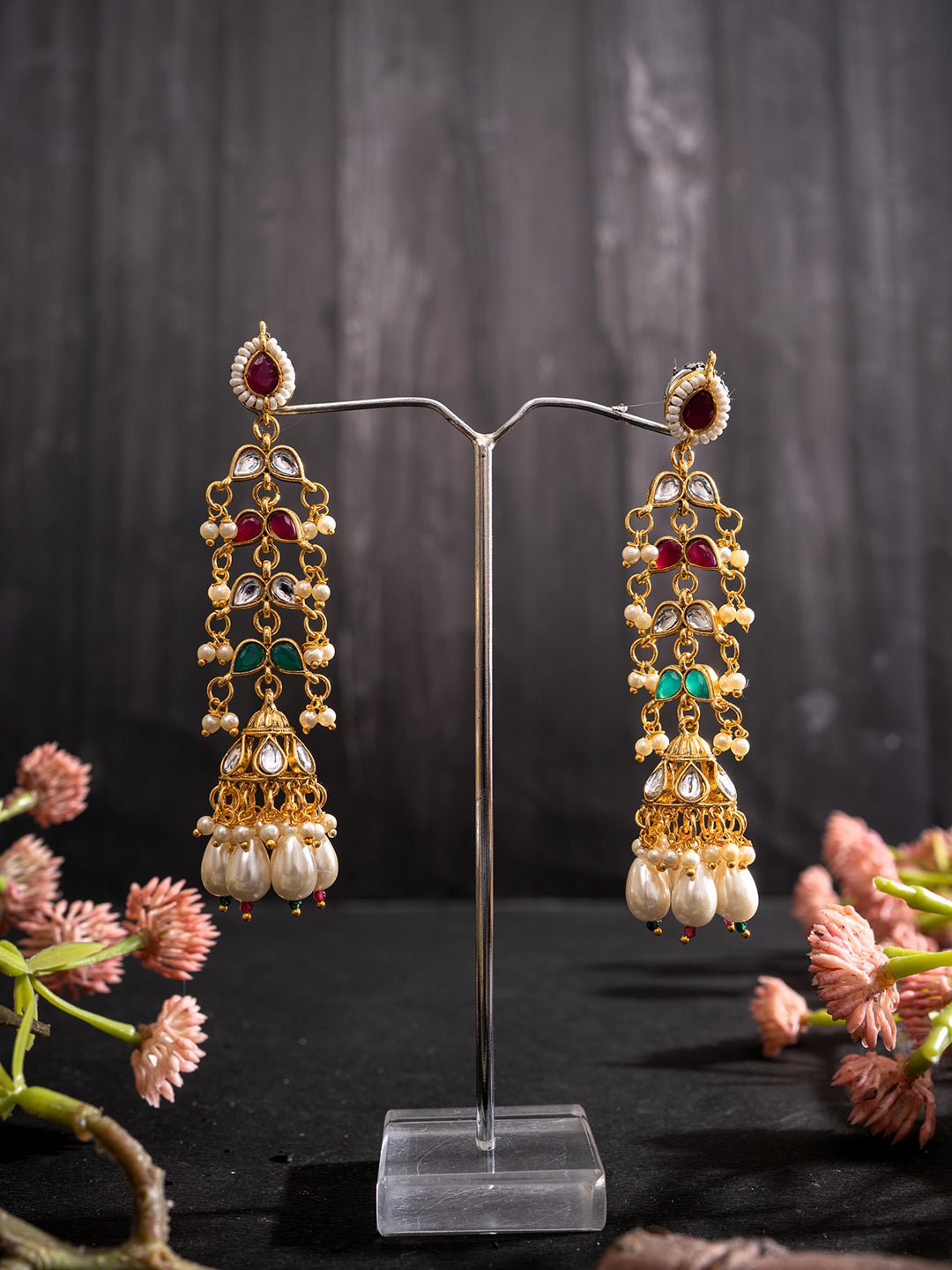 Gold-Plated Artificial Stones Studded & Beaded Contemporary Shaped Drop Earrings