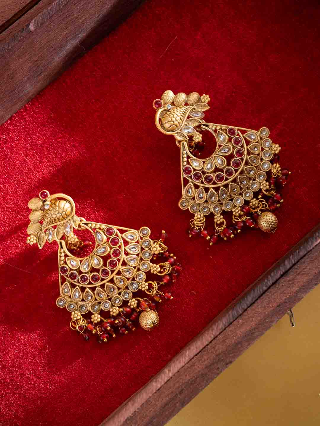 Gold-toned, red and white crescent shaped drop earrings, gold-plated, has has artificial stones studded and beaded details