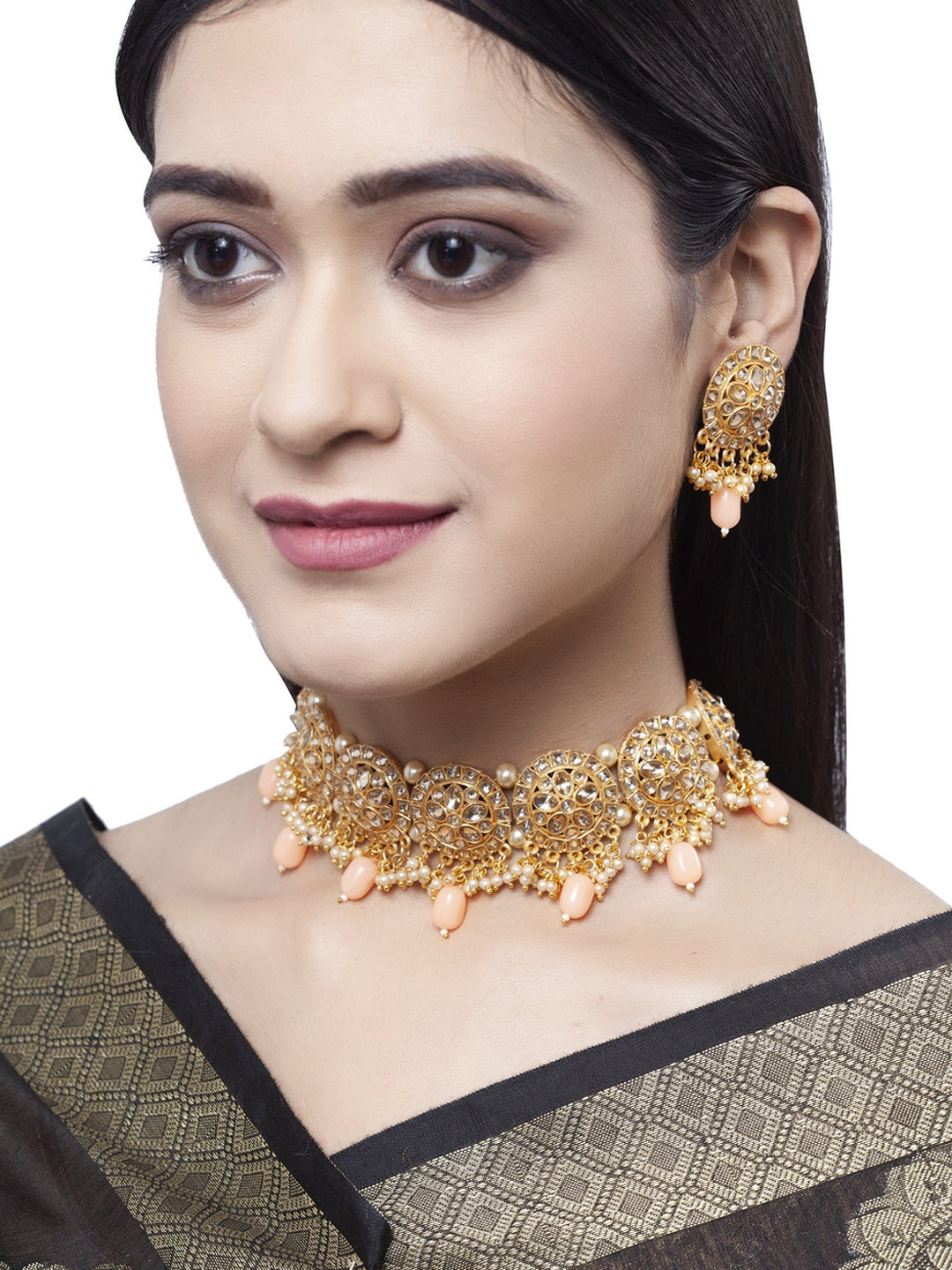 Gold-plated and LCT kundan-studded beaded handcrafted chocker necklace with intricate detailing, peach artificial beads, secured with drawstring fastening closure