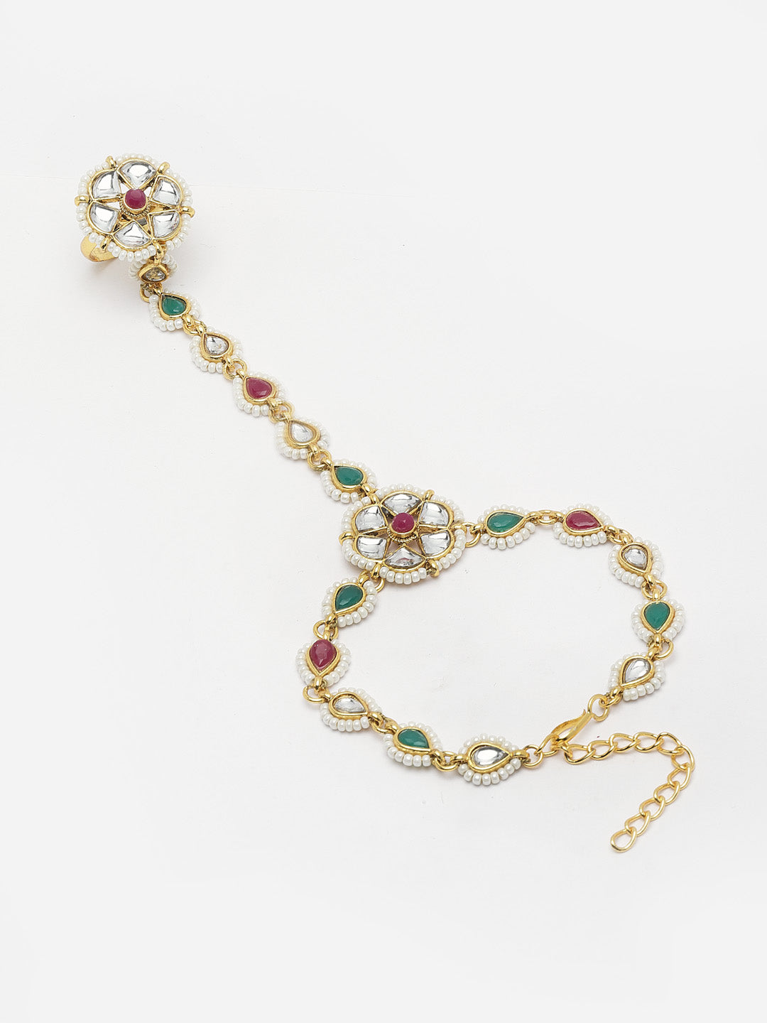 Gold-Plated Stone Studded & Beaded Ring Bracelet