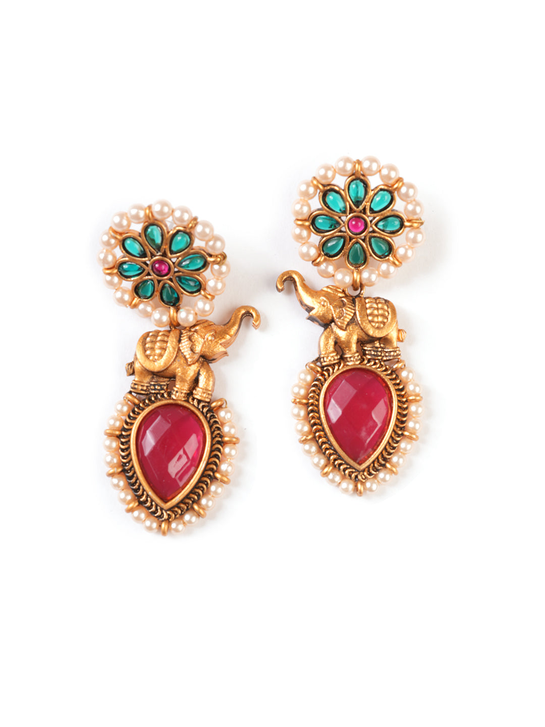 Gold-toned, red and white contemporary shaped drop earrings, gold-plated, stones studded and beaded details