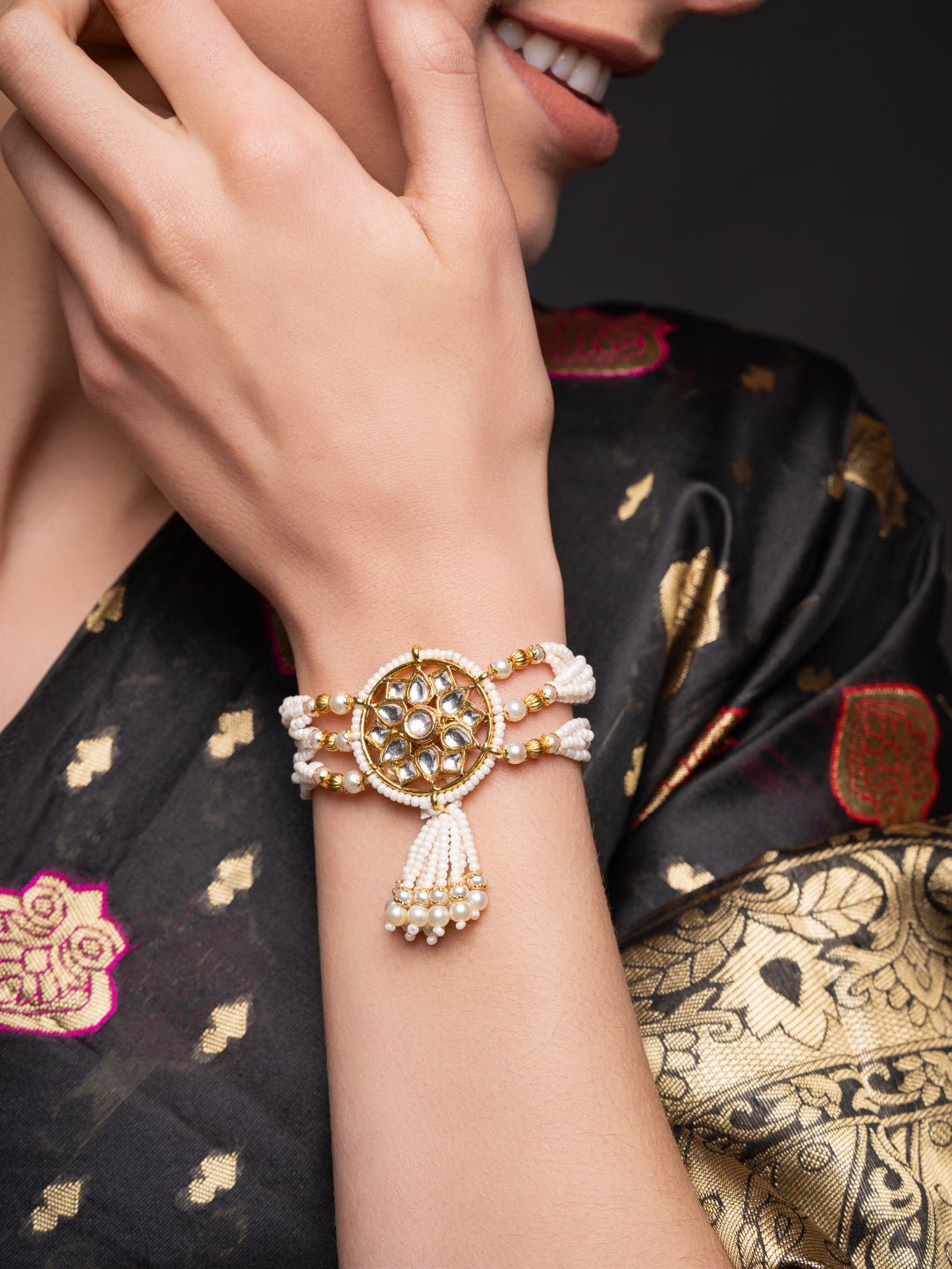 Gold-Plated Stones Studded And Beaded Wraparound Bracelet