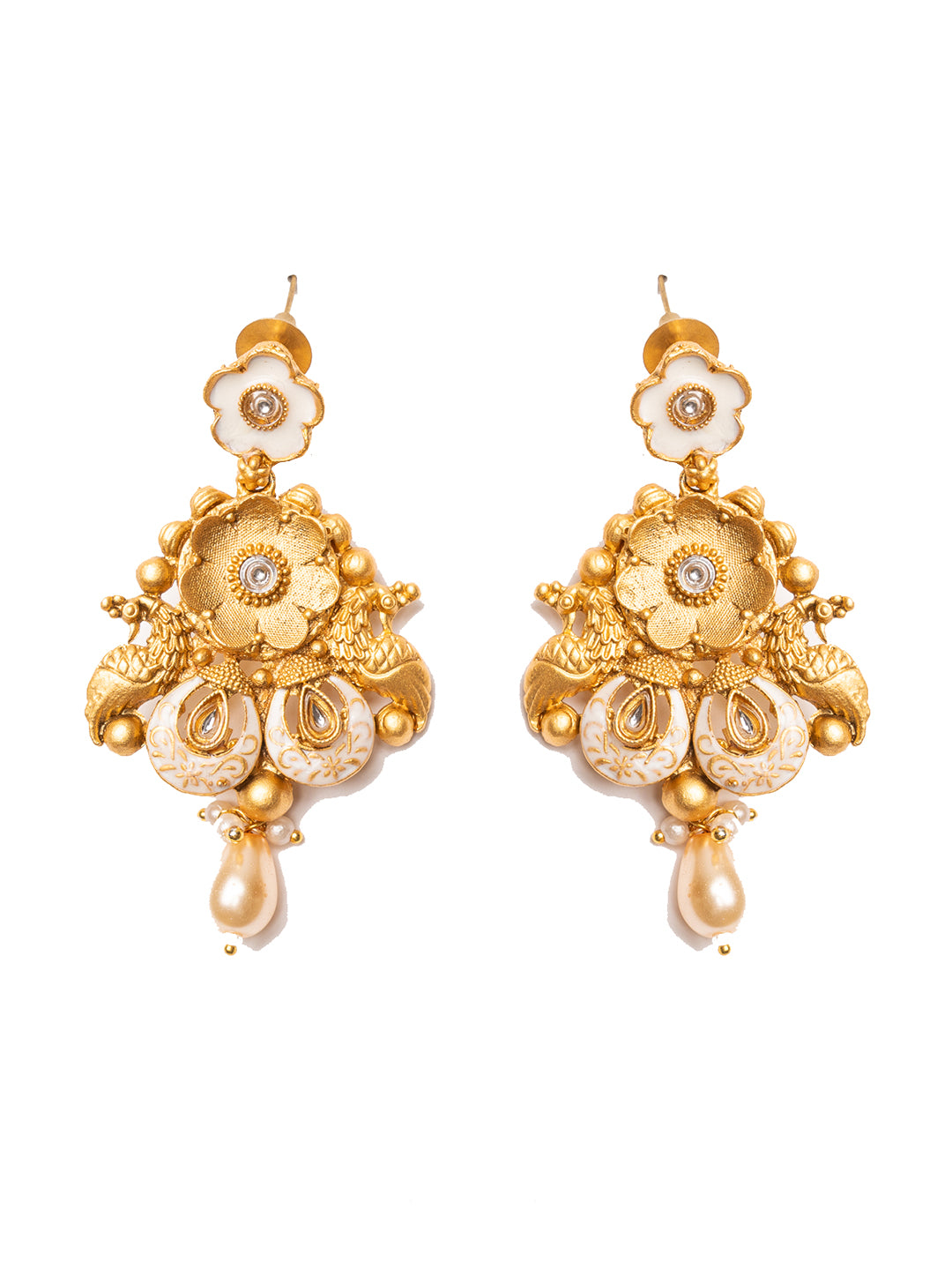 Gold-toned and white floral shaped drop earrings, gold-plated, has has stones studded and beaded details