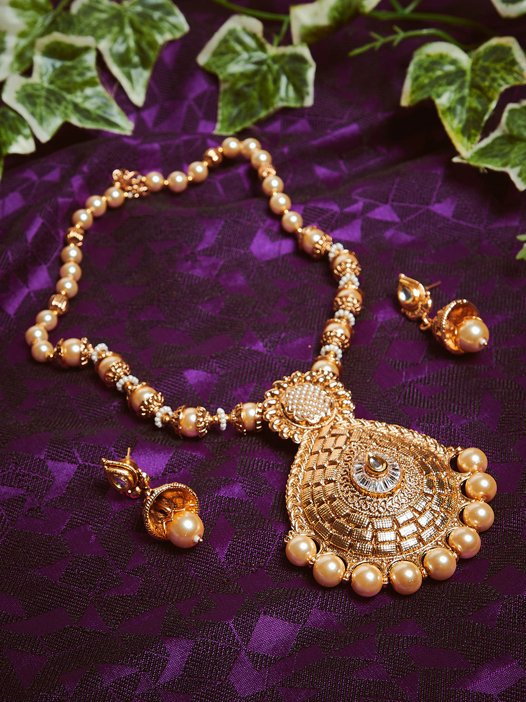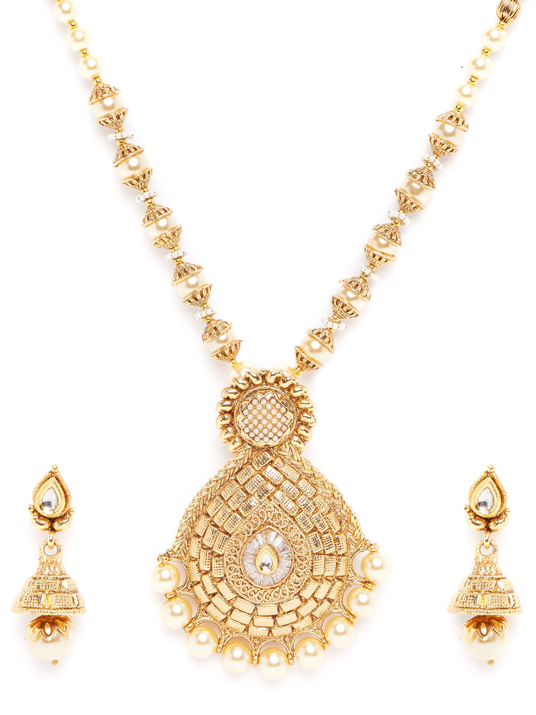 Gold-Plated & White Kundan Studded Beaded Handcrafted Jewellery Set