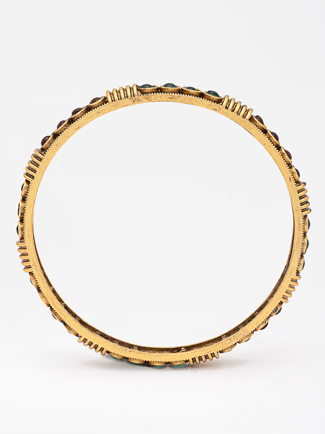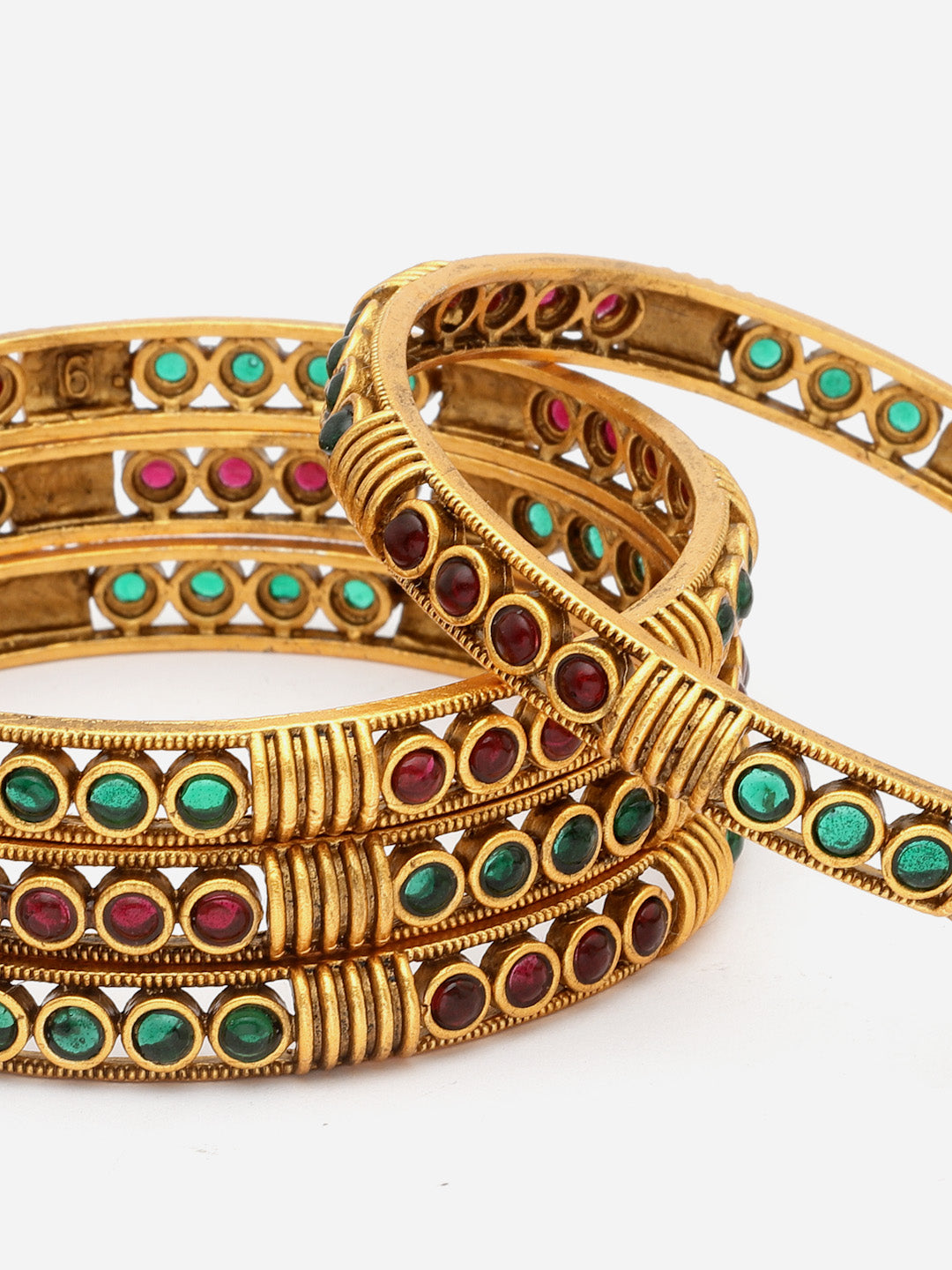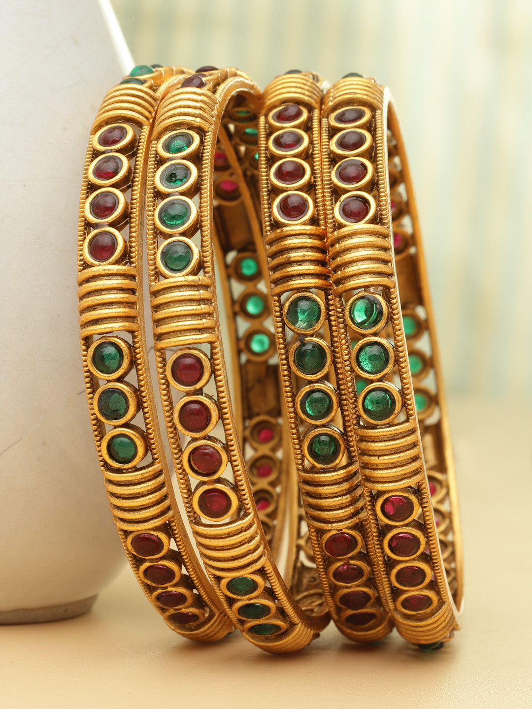 Set of four 24 CT gold-plated bangles, each has red and green stones-studded details, secured with slip-onclosure