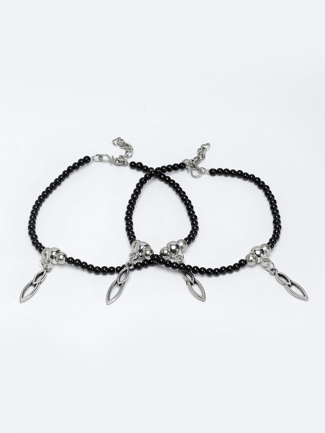 Set Of 2 Oxidized Silver-Plated Black Beaded Handcrafted Anklets