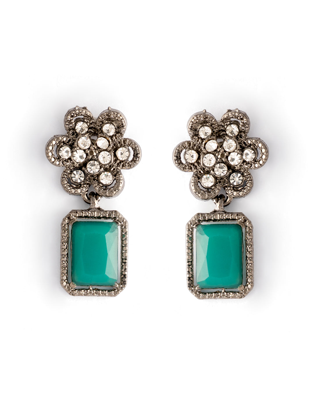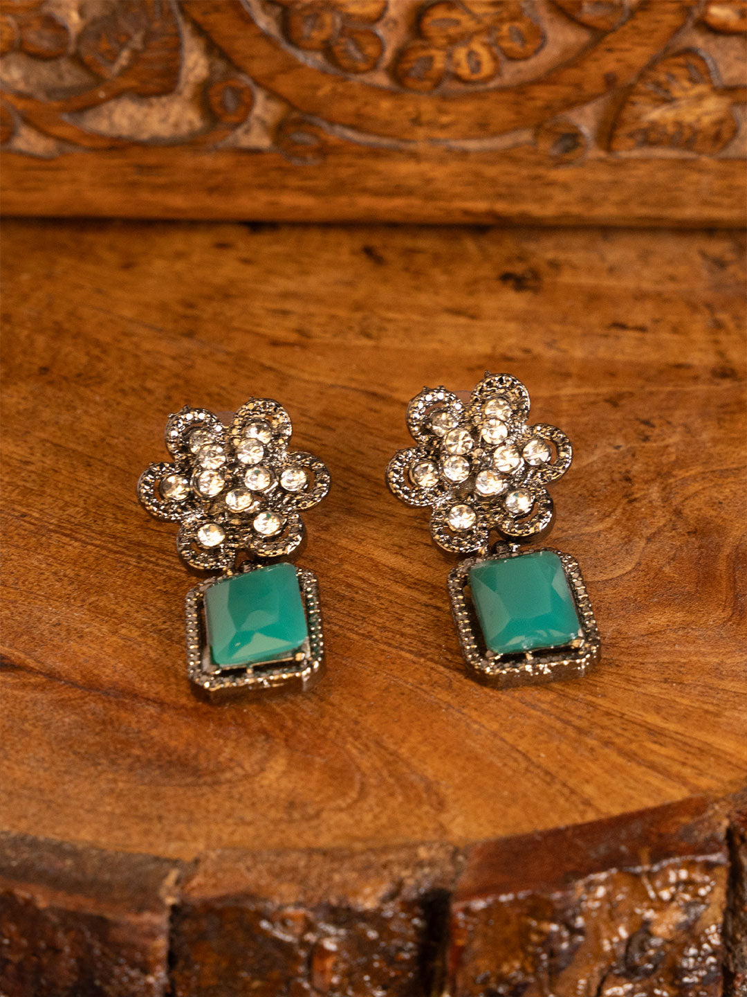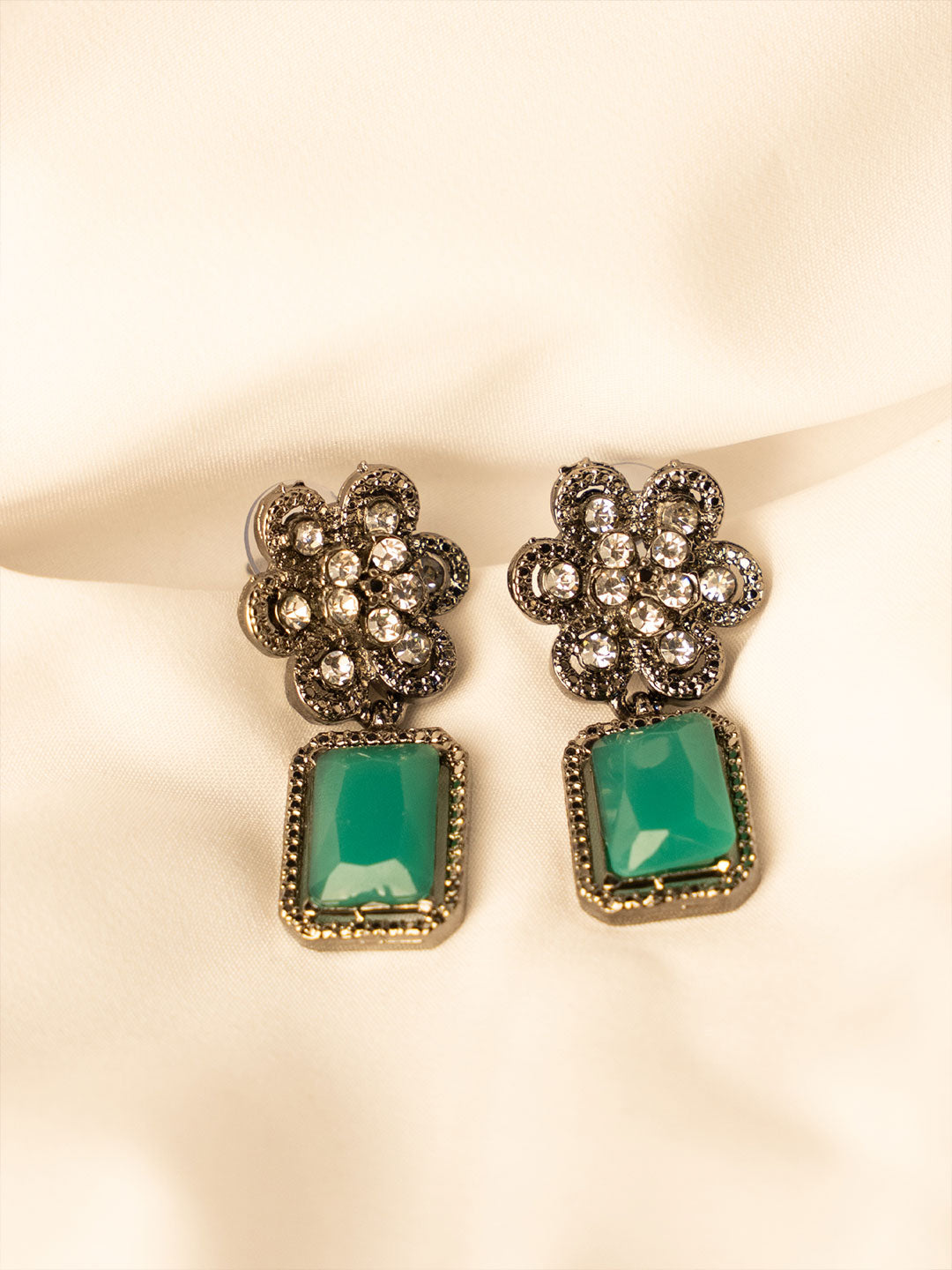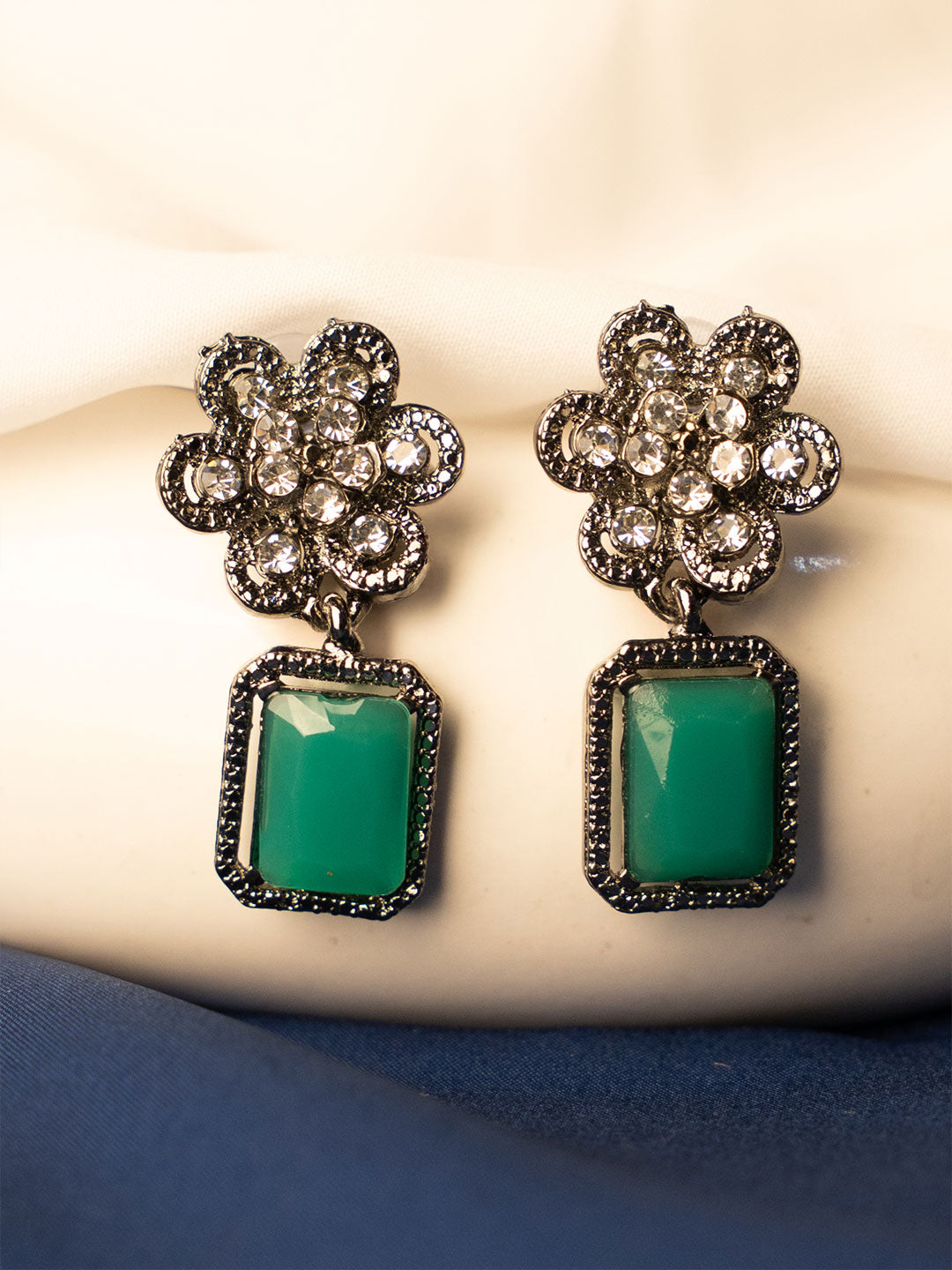 Silver-toned , green and white floral drop earrings, silver-plated, has american diamond studded, details