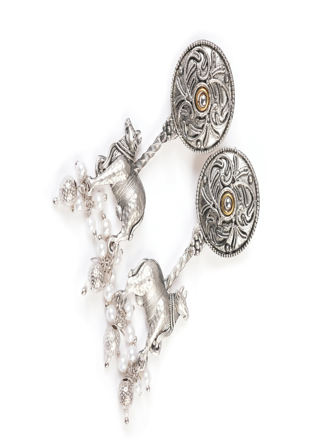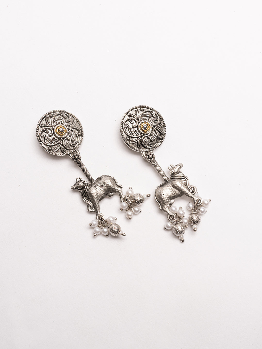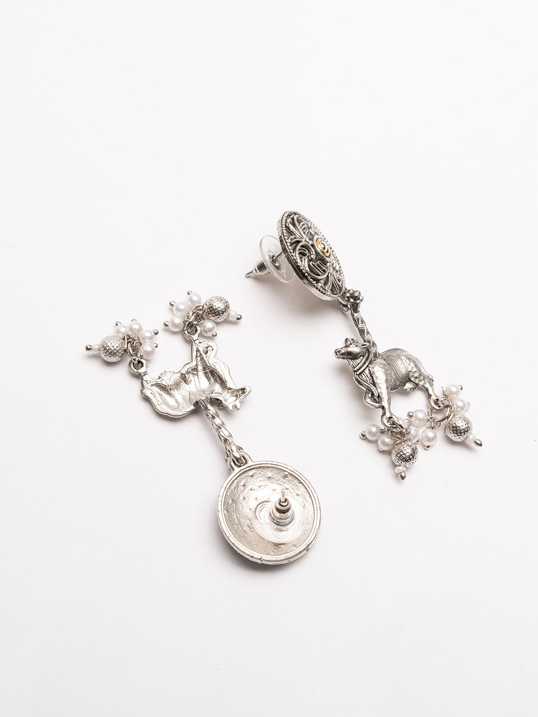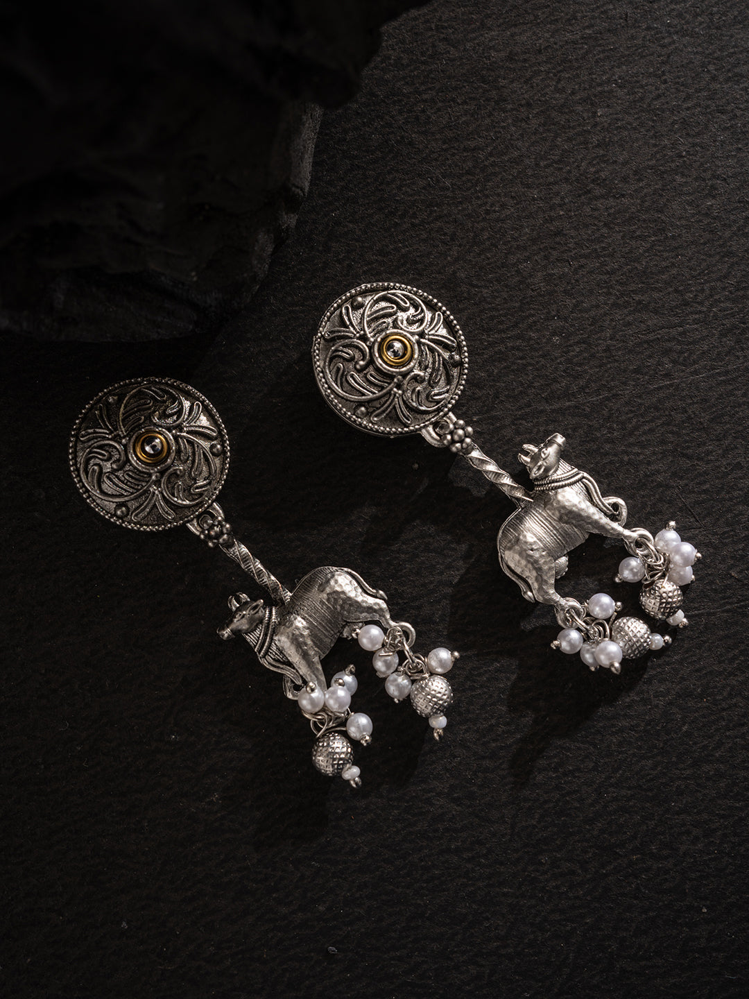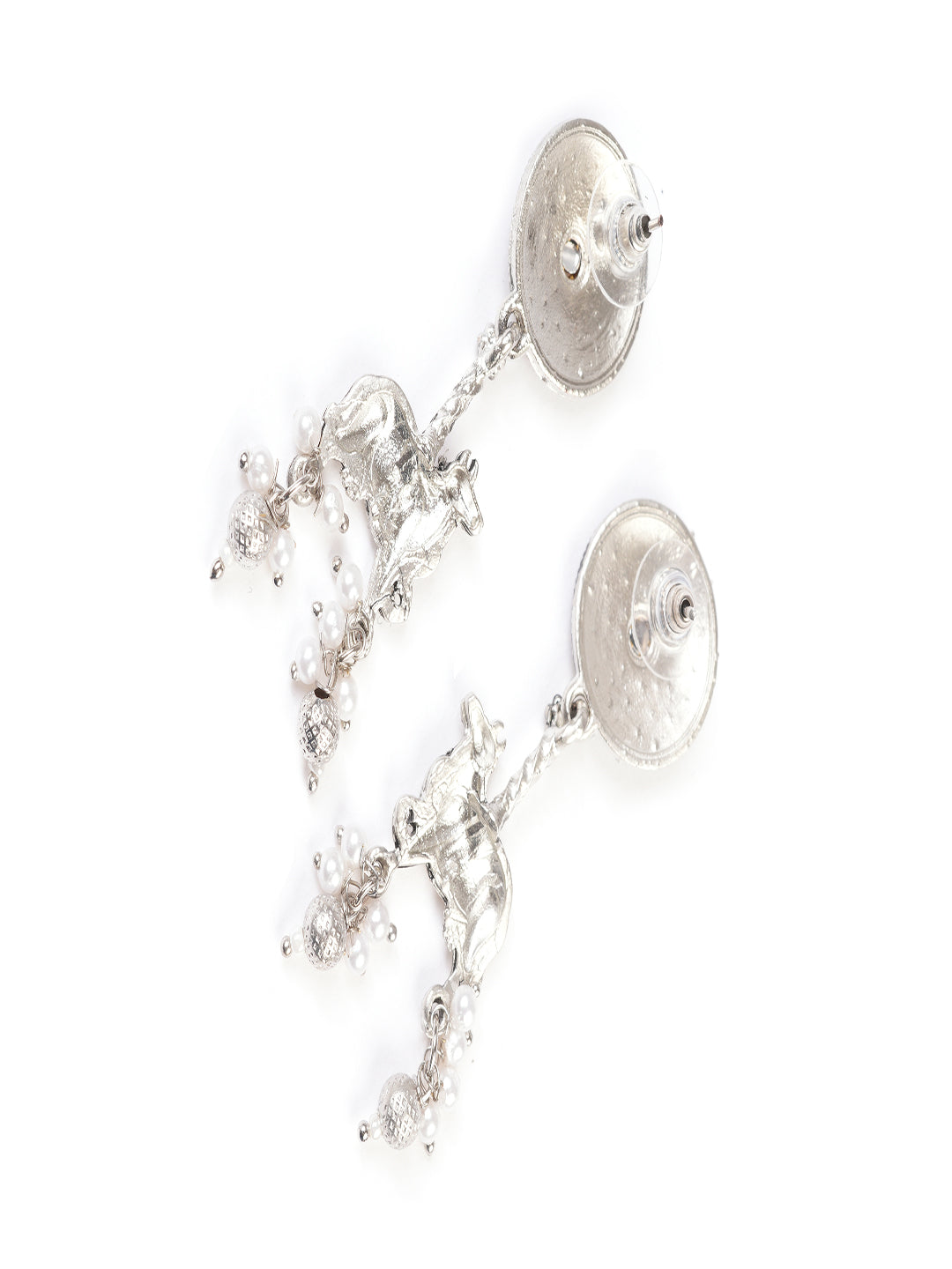 Silver-Plated Artifical Beaded Animal Shaped Oxidised Drop Earrings