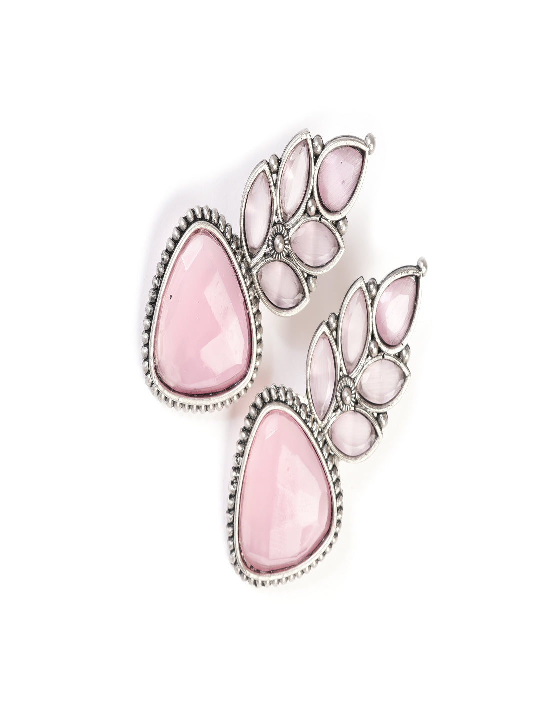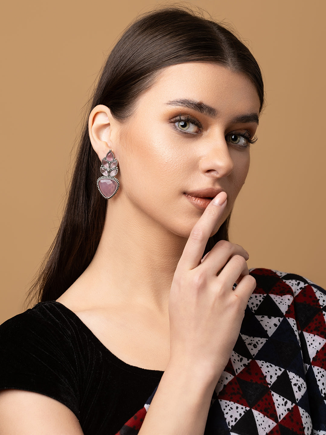 Silver-Plated Artifical Stones Studded Geometric Shaped Oxidised Drop Earrings