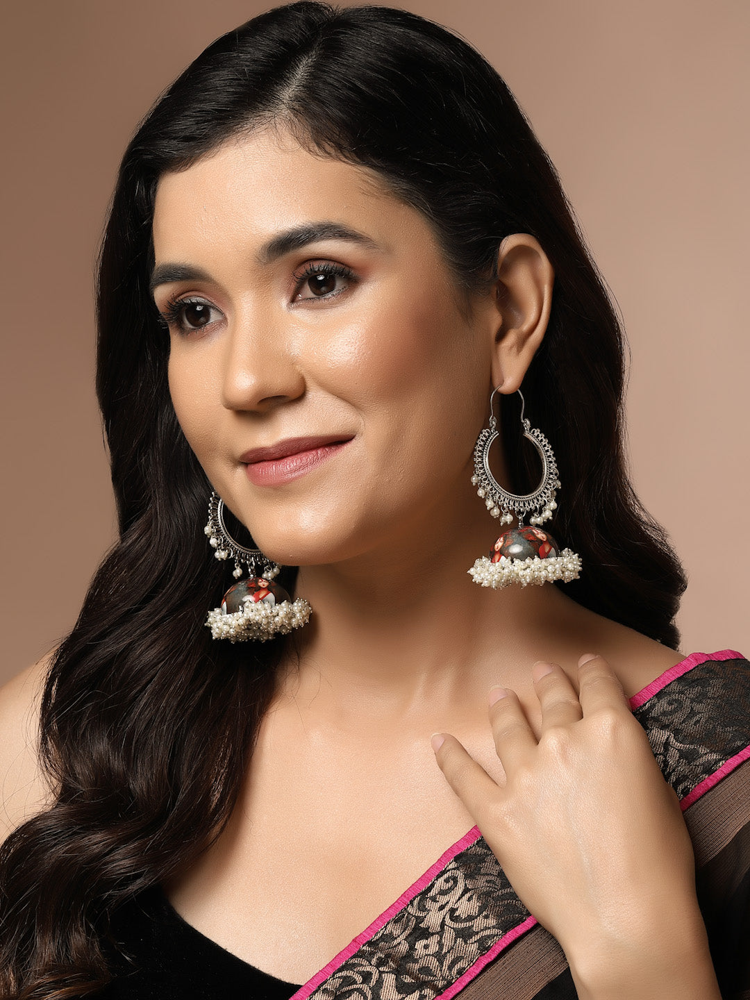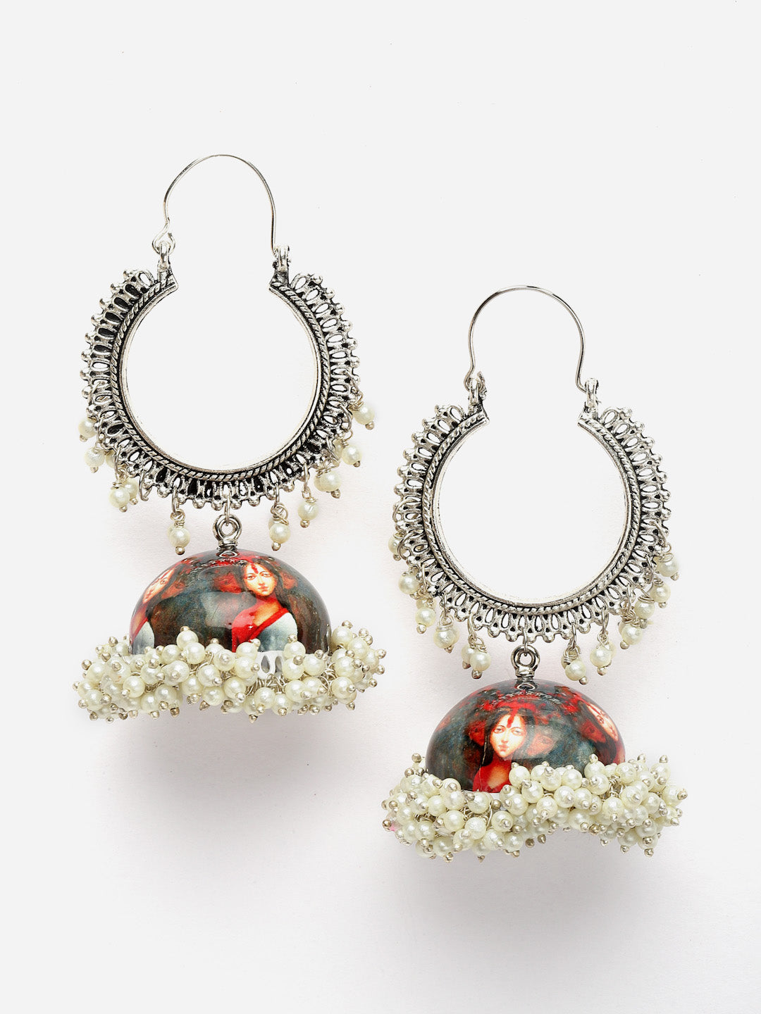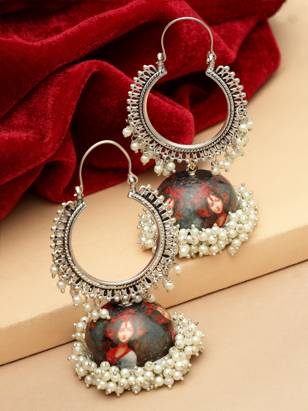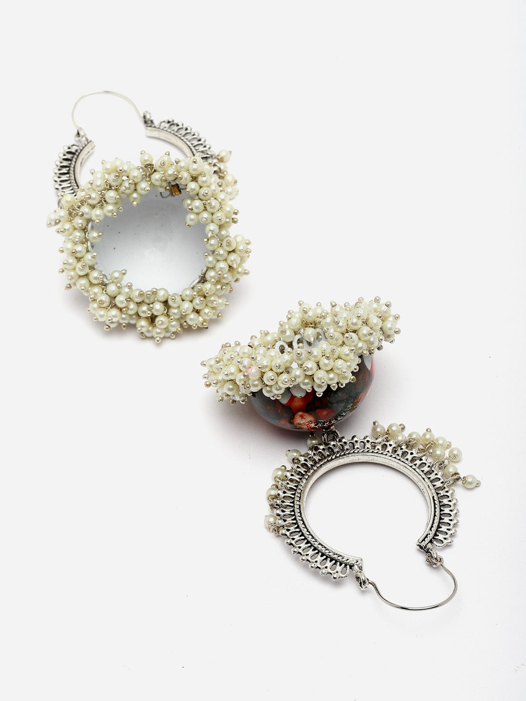 Silver-toned contemporary jhumkas, silver-plated, has pearls