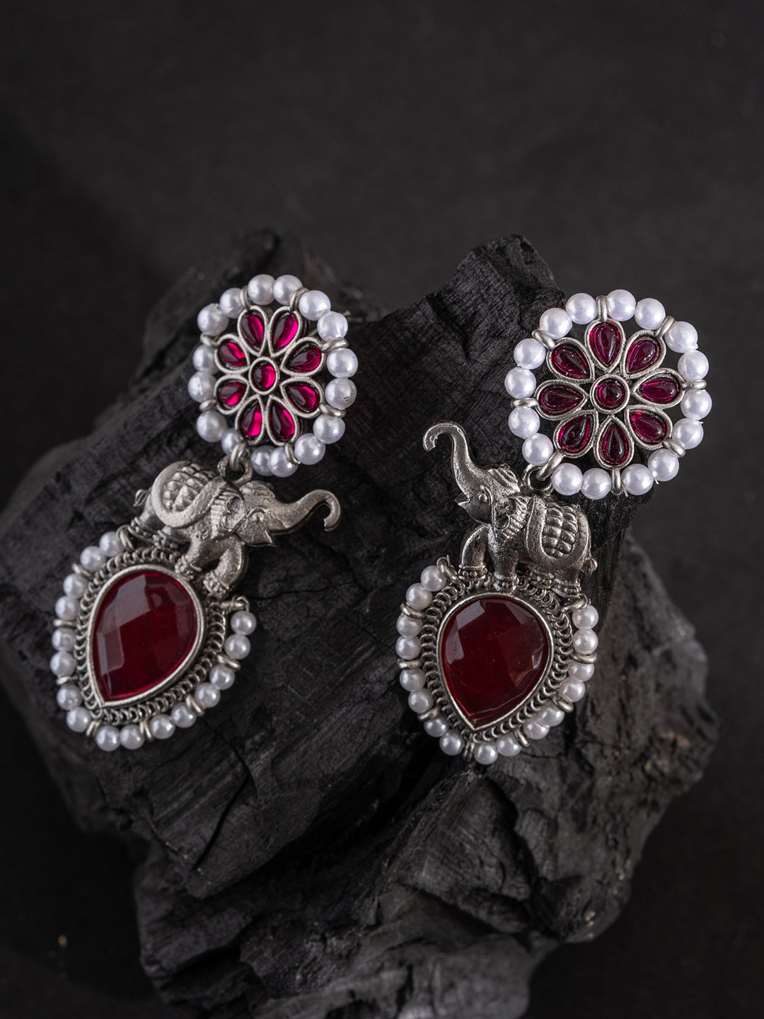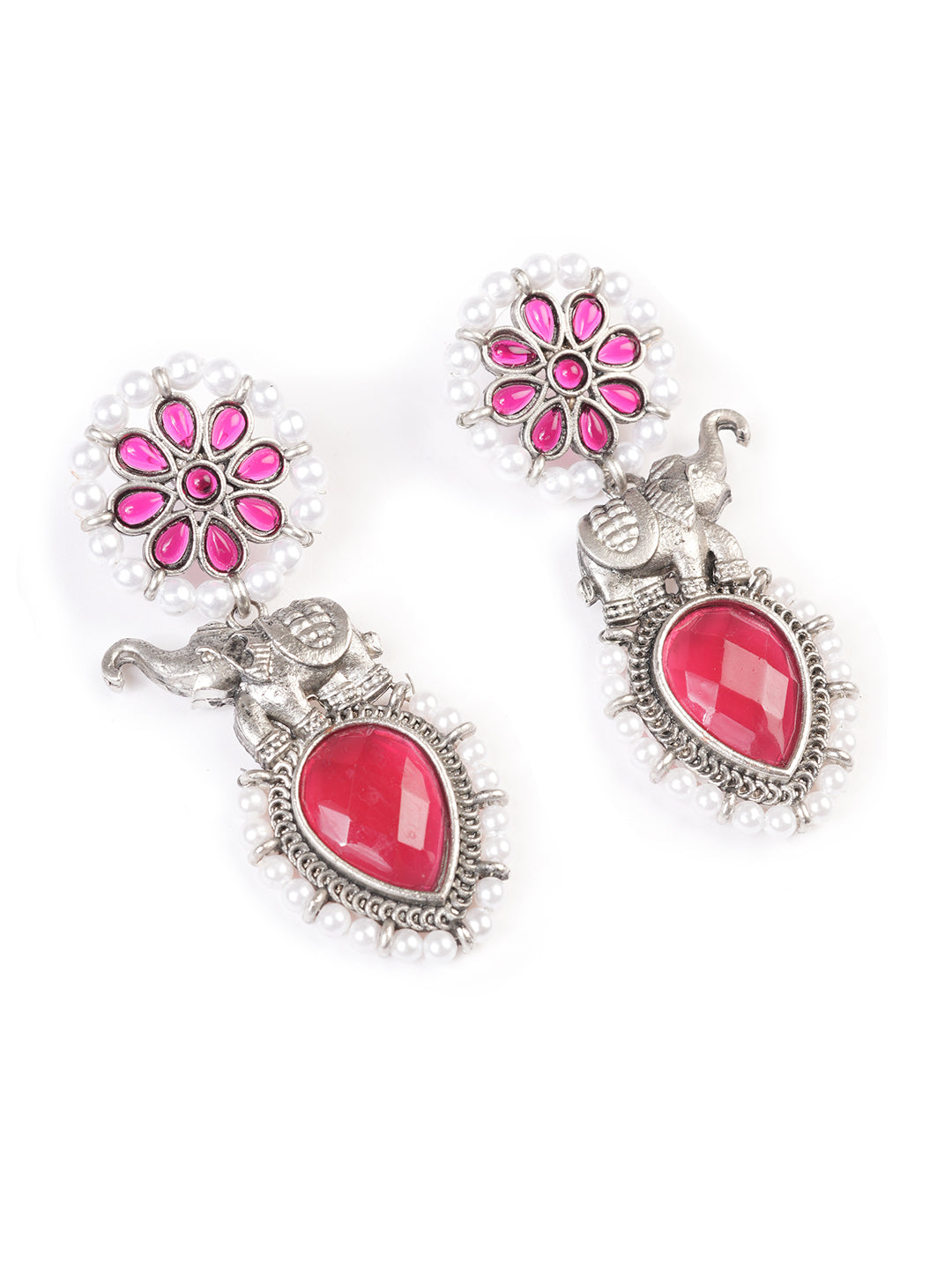 Silver-Plated Stones Studded And Beaded Animal Shaped Oxidised Drop Earrings
