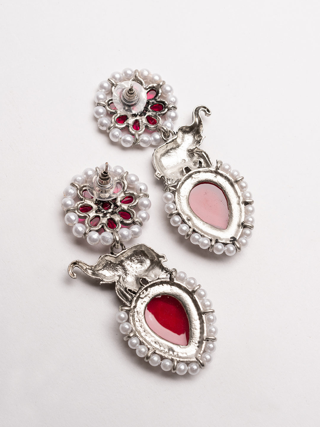 Silver-toned, maroon and white animal shaped drop earrings, silver-plated, has artificial stones studded and beaded