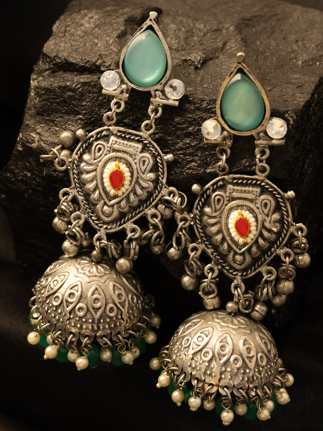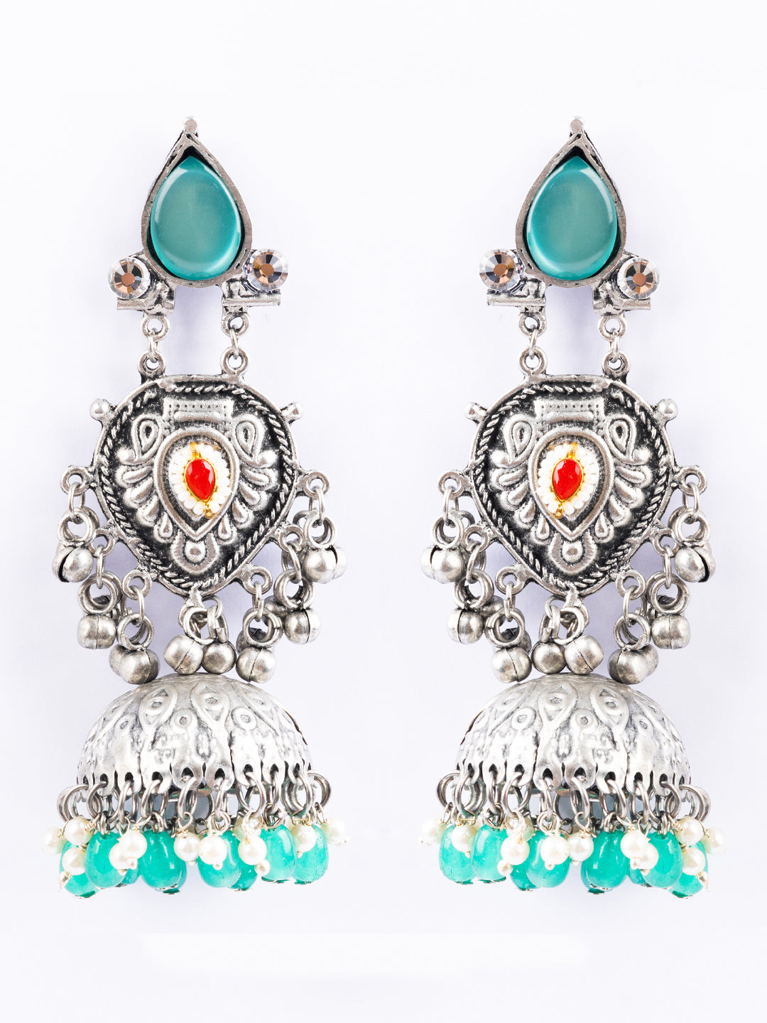 Silver-Plated Stones Studded And Beaded Contemporary Oxidised Drop Earrings