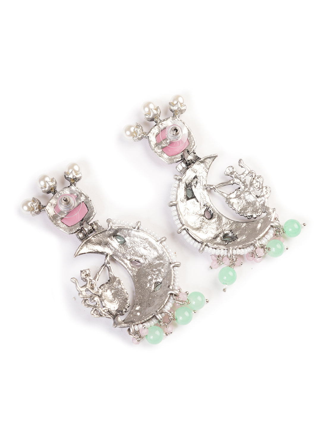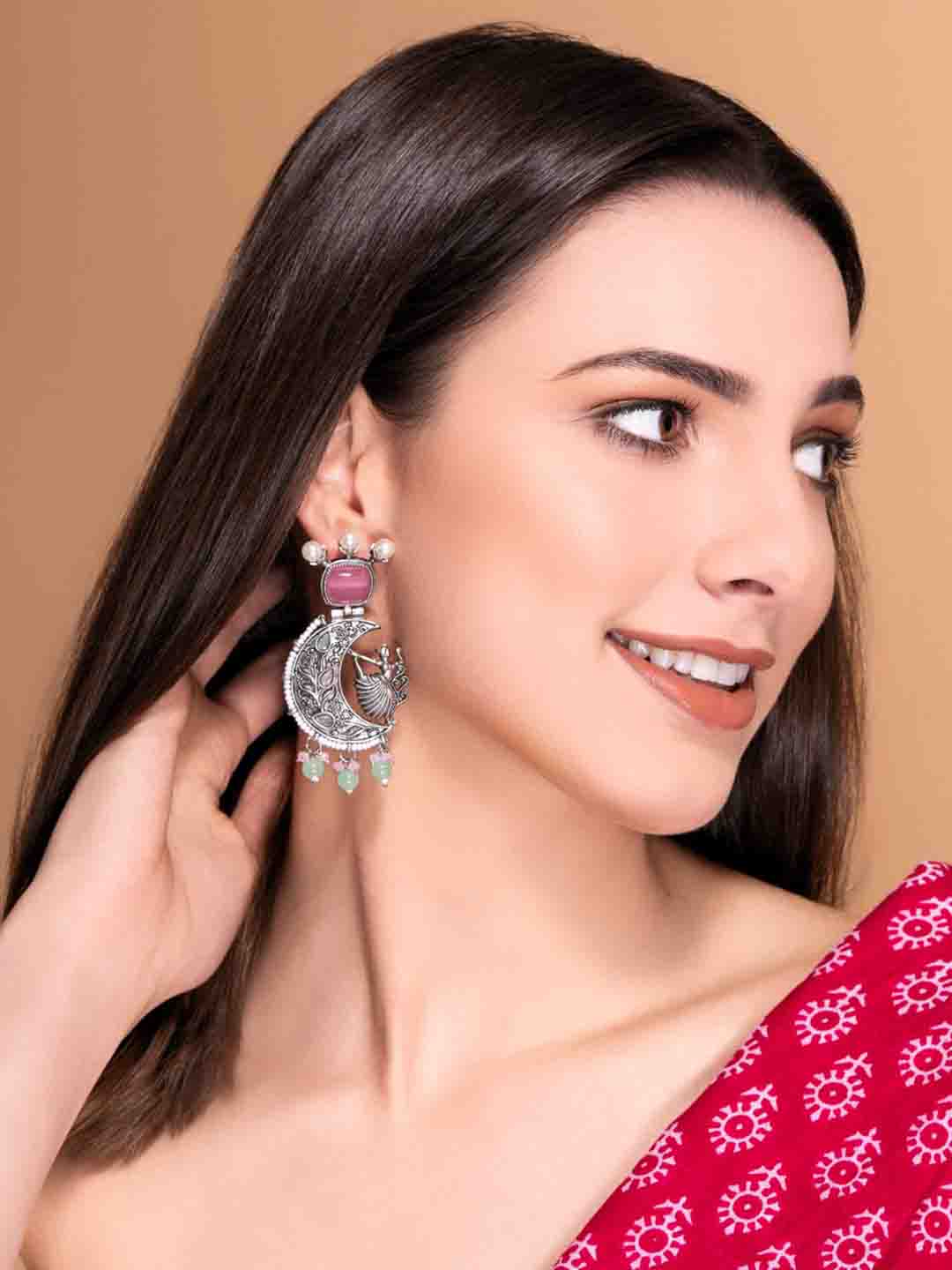 Silver-toned, pink and green contemporary shaped oxidized drop earrings, silver-plated, artificial stones studded and beaded details