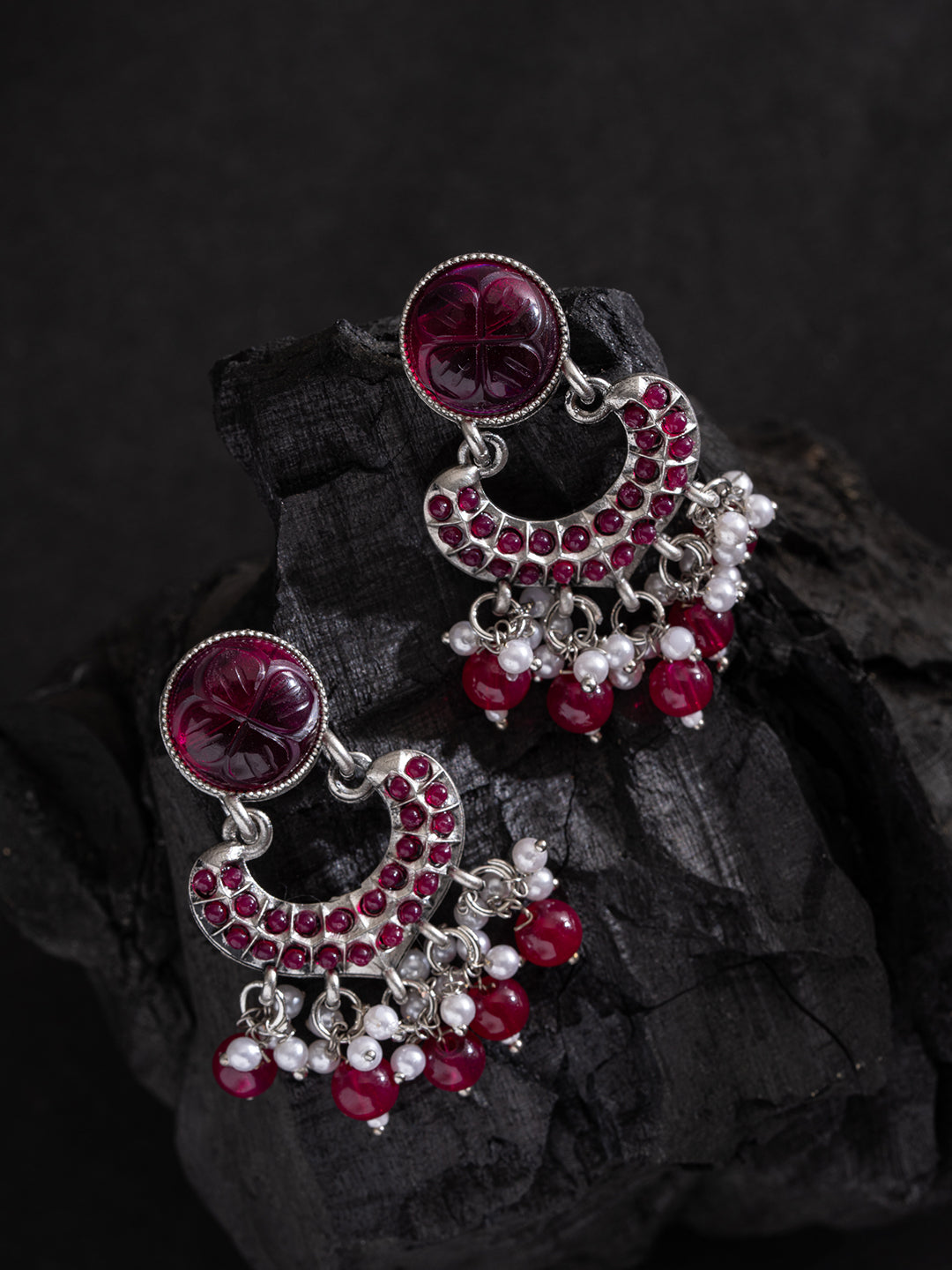 Silver-Plated Stones Studded And Beaded Contemporary Shaped Oxidized Drop Earrings