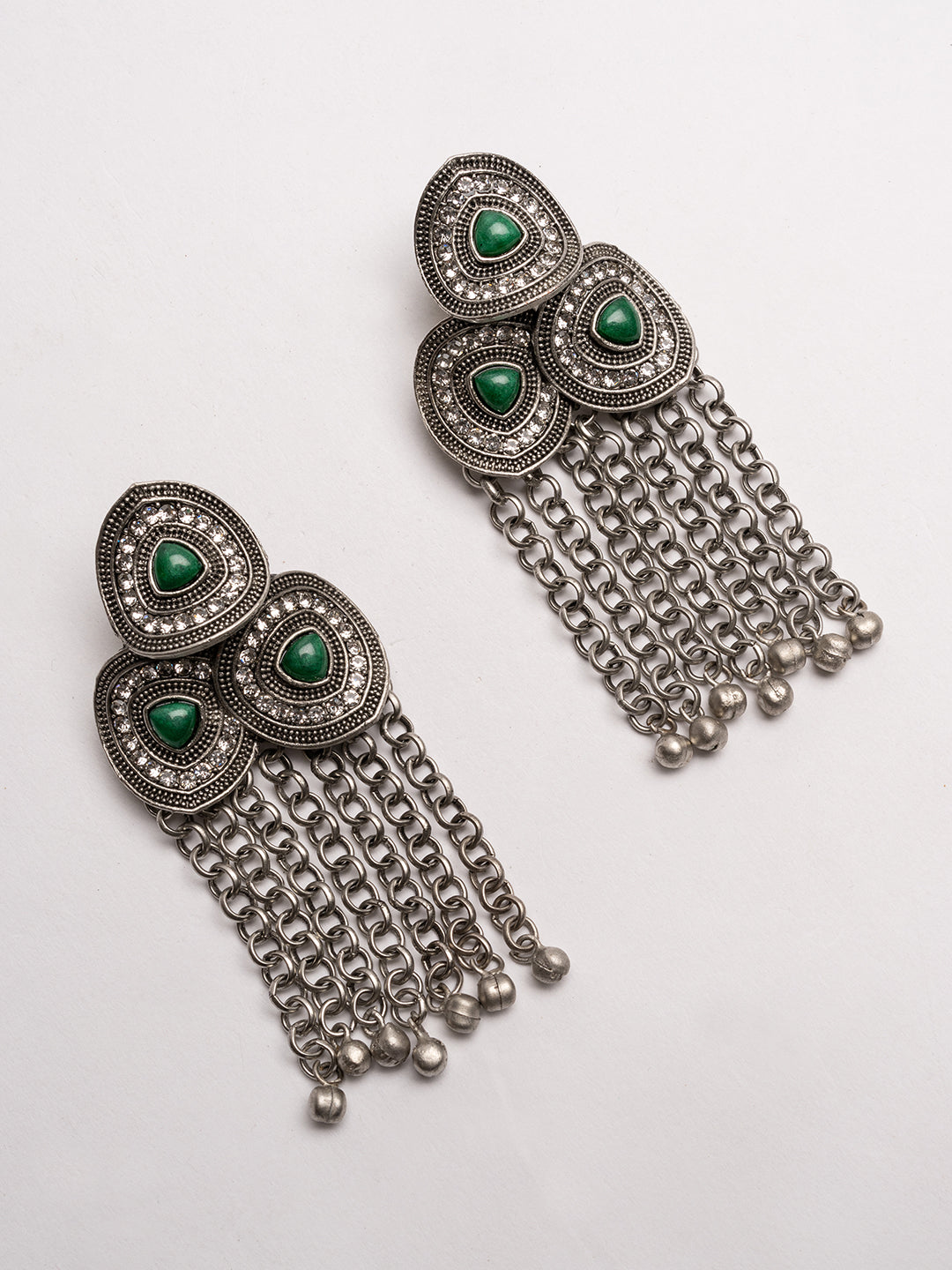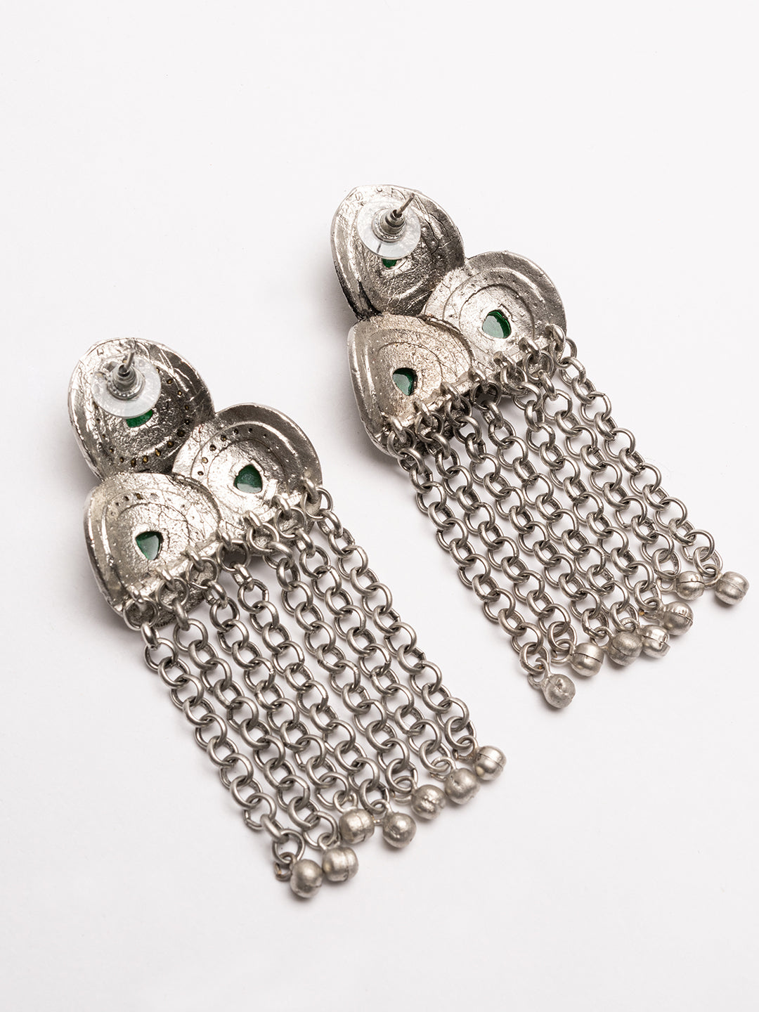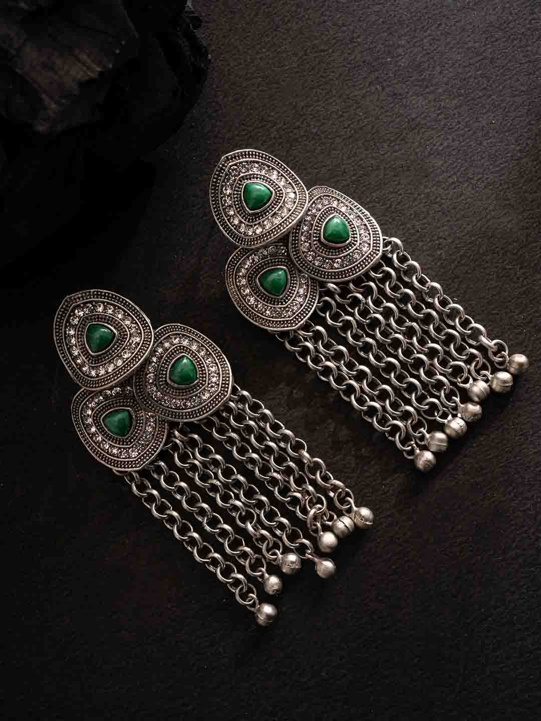Silver-toned and green contemporary shaped oxidized drop earrings, silver-plated, artificial stones studded and beaded details