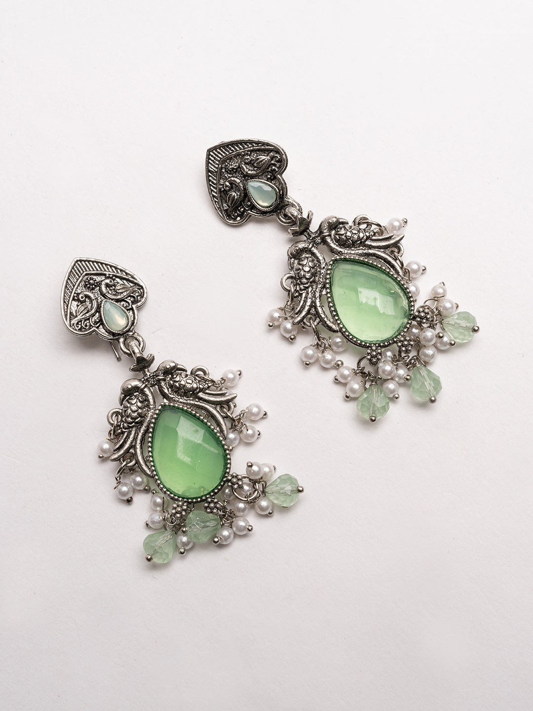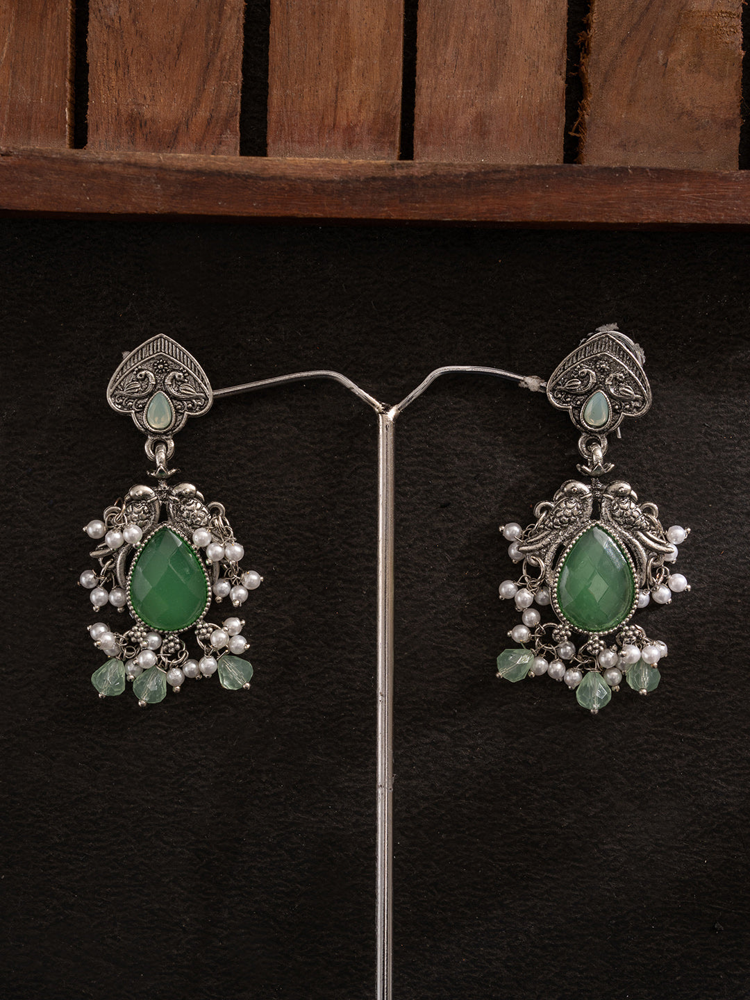 Silver-toned, white and green contemporary shaped oxidized drop earrings, silver-plated, artificial stones studded and beaded details