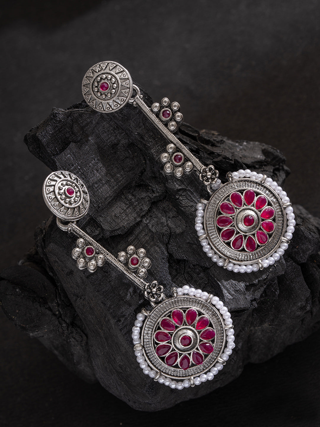 Silver-toned and pink contemporary shaped oxidized drop earrings, silver-plated, stones studded details