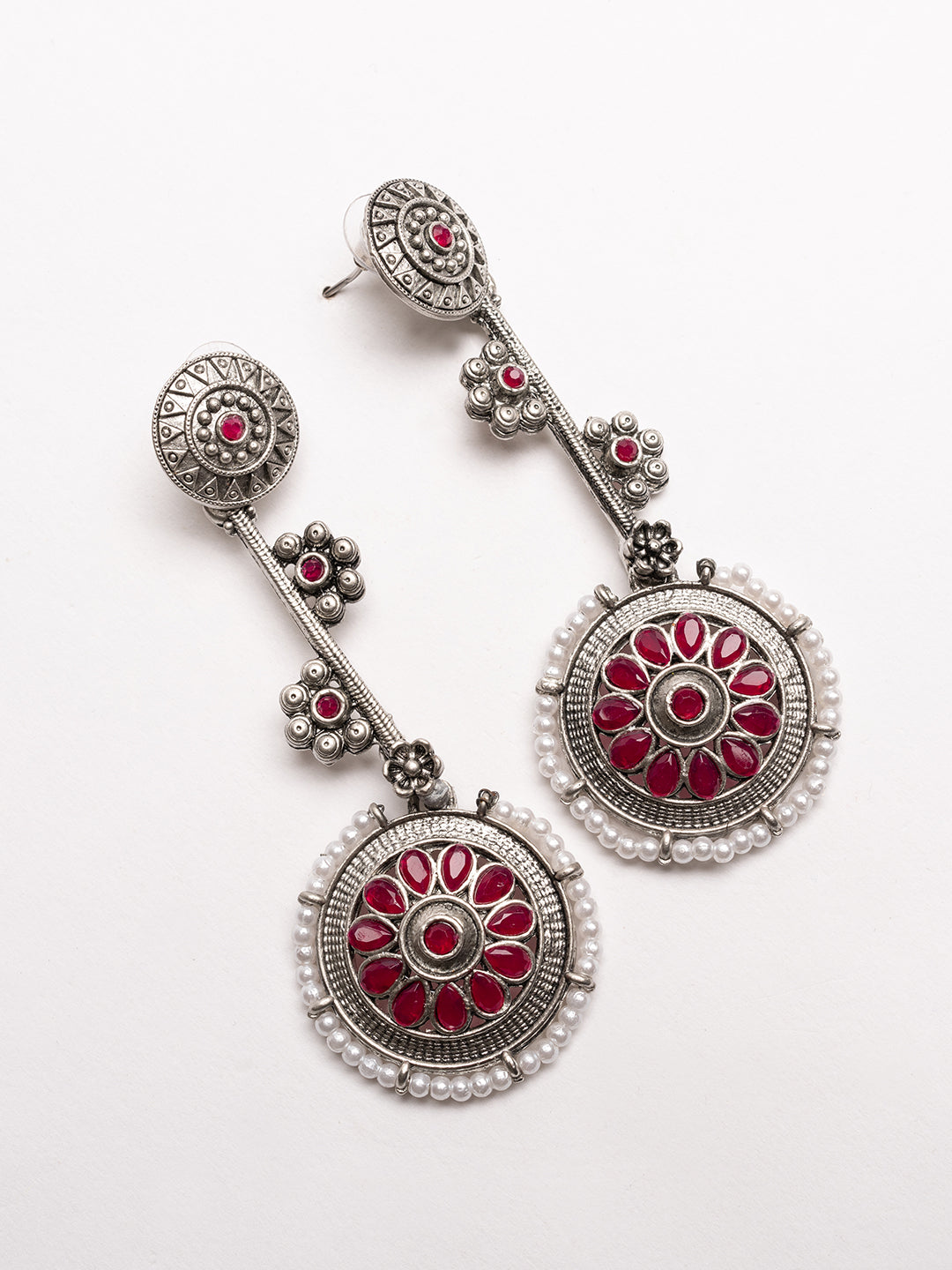 Silver-Plated Stones Studded Contemporary Shaped Oxidized Drop Earrings