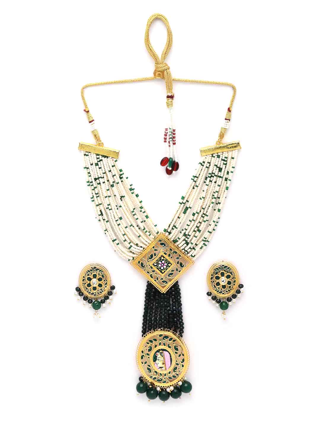 Gold-plated necklace, has white and green pearls beaded details with centrepiece, secured with a drawstring closure