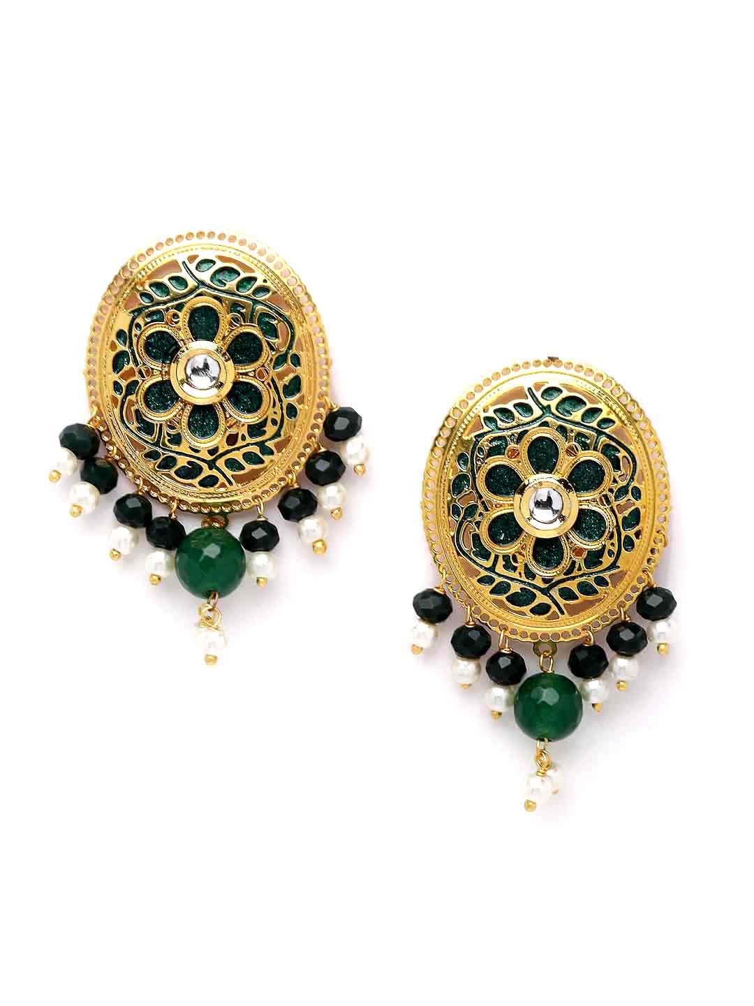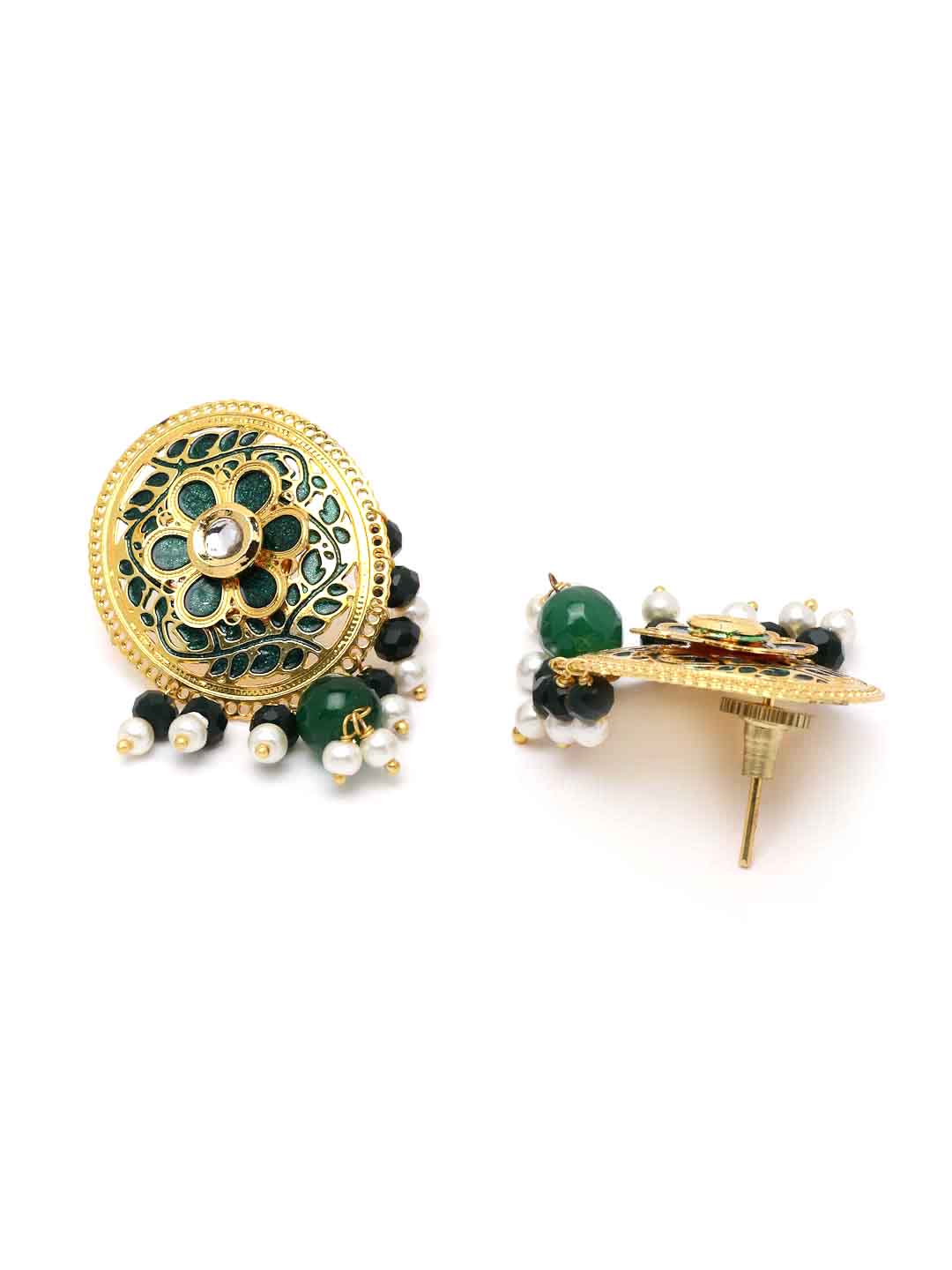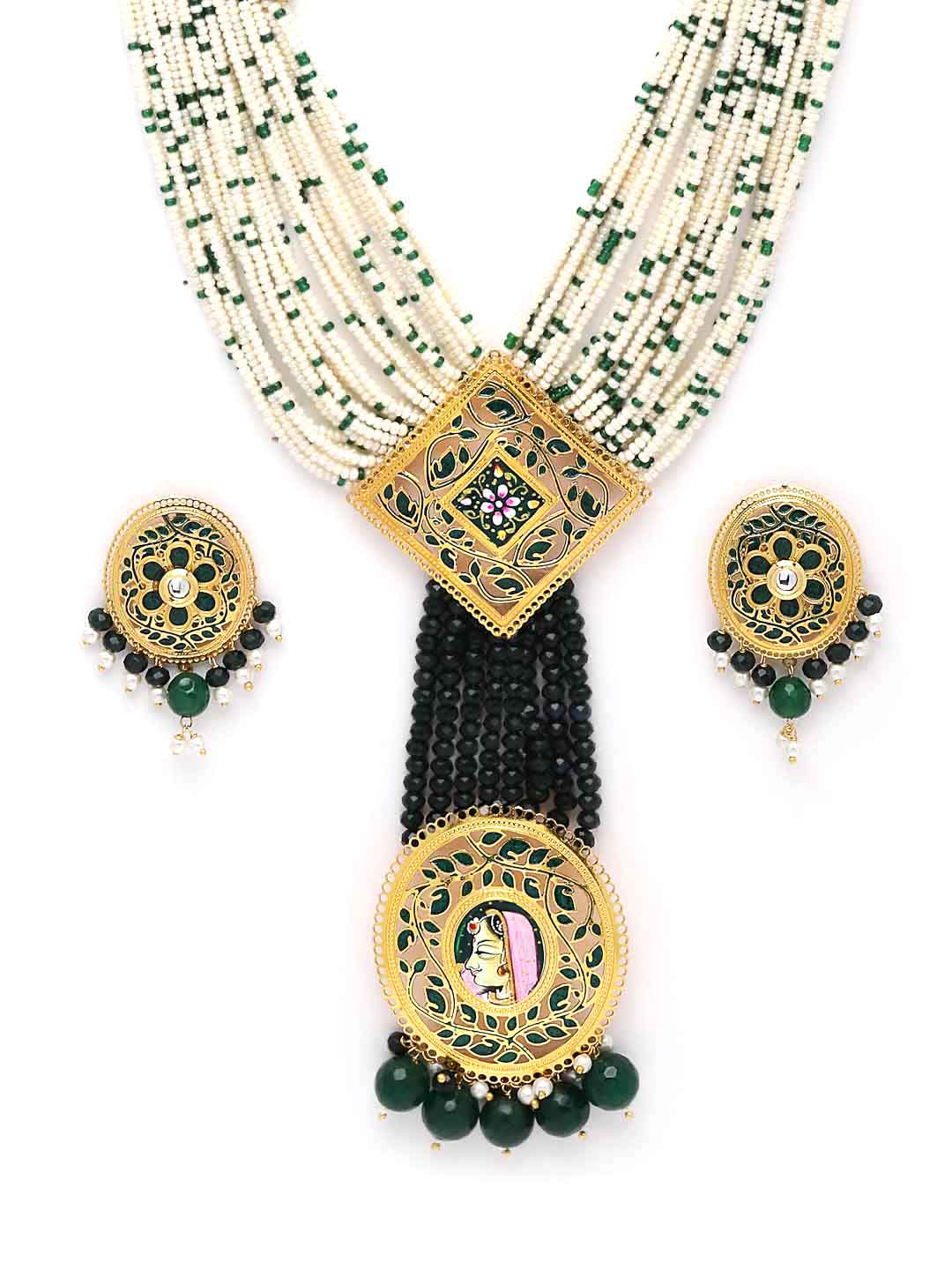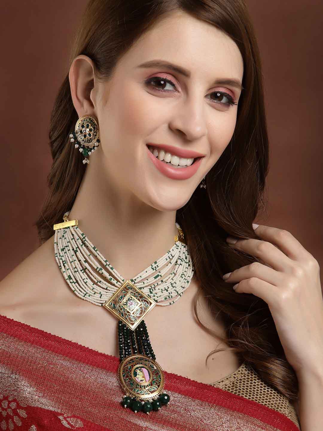 Women Gold-Plated White & Green Pearl Beaded Choker Jewellery Set